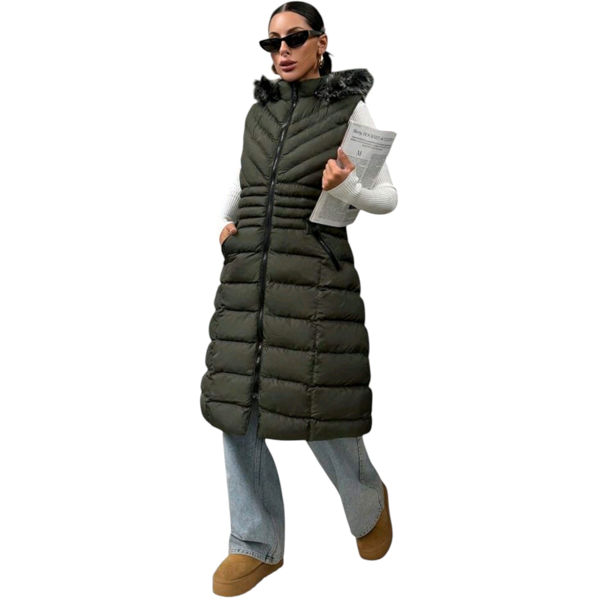 Címke nélküli, zöld, hosszú, pufi mellény, fix kapucnival, a kapucnin műszőrme díszítéssel, elöl végig cipzáros, V-alakú és vízszintes steppeléssel.