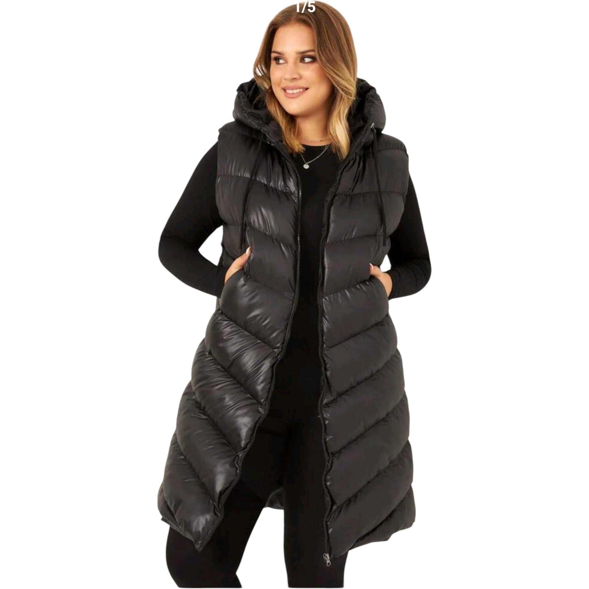 Címke nélküli, fekete, hosszú, fényes felületű pufi mellény, fix kapucnival, elöl végig cipzáros, V-alakú és vízszintes steppeléssel.