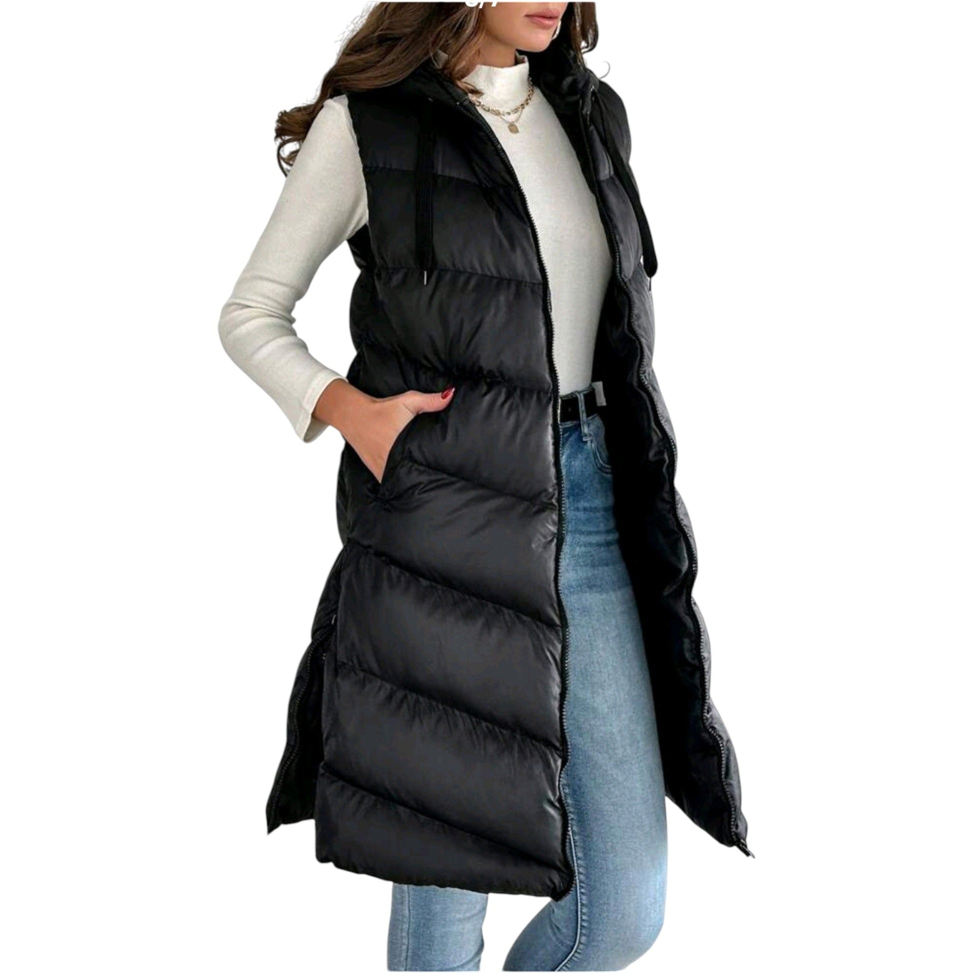 Címke nélküli, fekete, hosszú, pufi mellény, fix kapucnival, elöl végig cipzáros, oldalán slicceléssel/cipzárral, V-alakú és vízszintes steppeléssel.