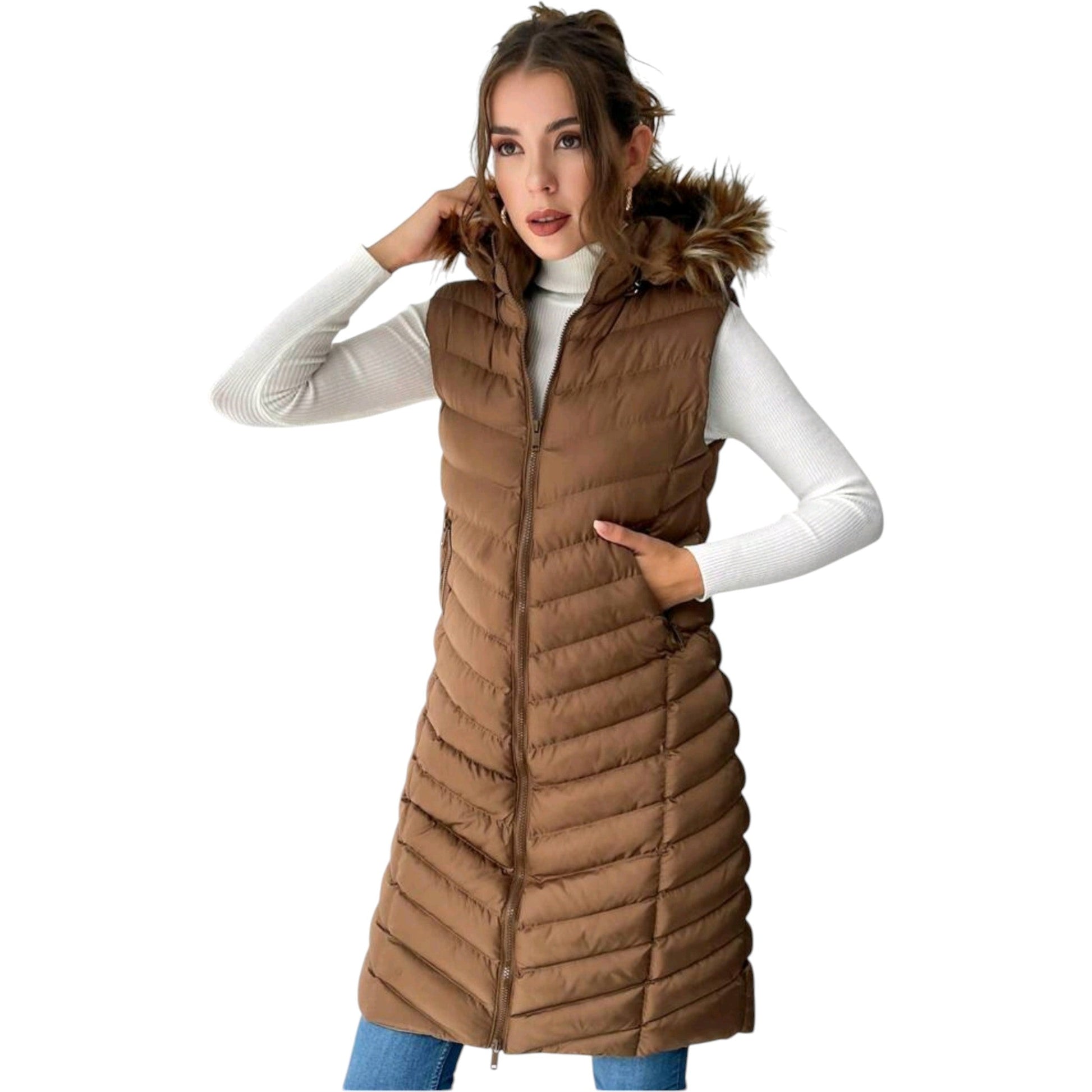 Címke nélküli, barna, hosszú, pufi mellény, fix kapucnival, a kapucnin műszőrme díszítéssel, elöl végig cipzáros, V-alakú és vízszintes steppeléssel.