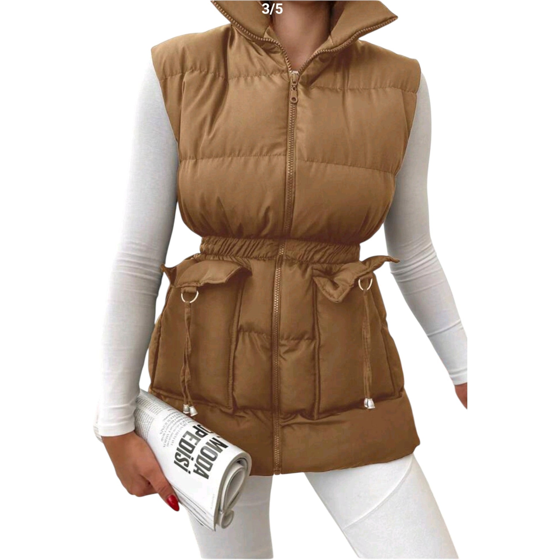 Címke nélküli, barna, pufi mellény, elöl végig cipzáros, magas álló gallérral, derékban gumírozott szűkítéssel, elöl felvarrt díszzsebekkel.