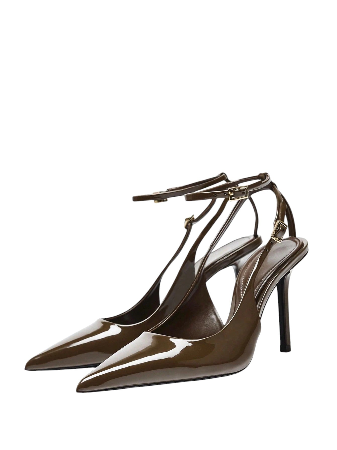Címke nélküli, barna, lakkbőr, hegyes orrú, tűsarkú, bokapántos slingback cipő arany színű csattal. Belső talp hossz: 24,5cm
