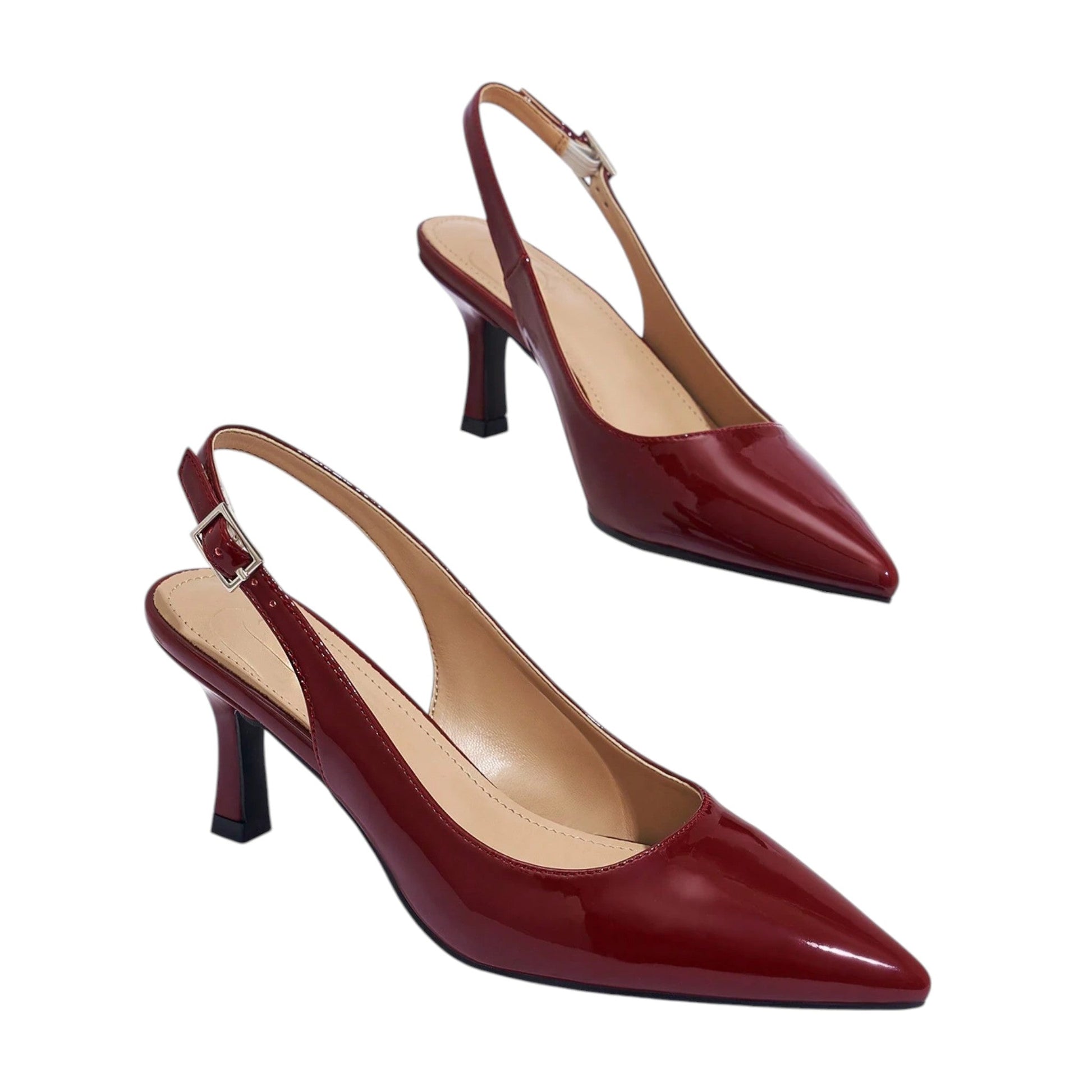 Címke nélküli, bordó, lakk hatású, hegyes orrú, slingback magassarkú. Belső talp hossz: 25,5cm