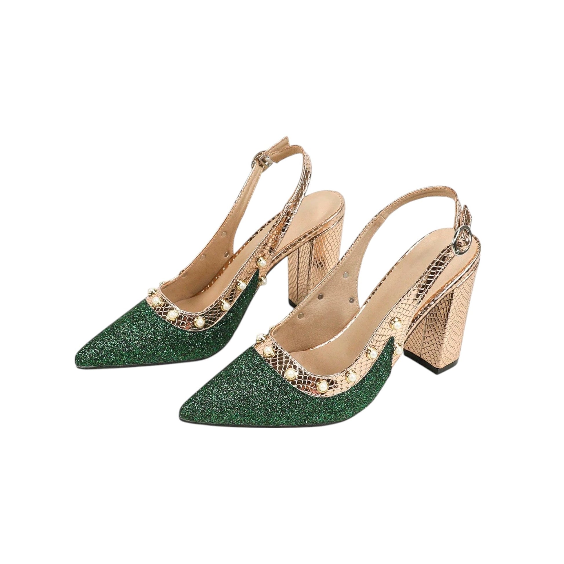 Címke nélküli, zöld színű, magas sarkú, hegyes orrú, csillámos cipő. Belső talp hossz: 24,5cm