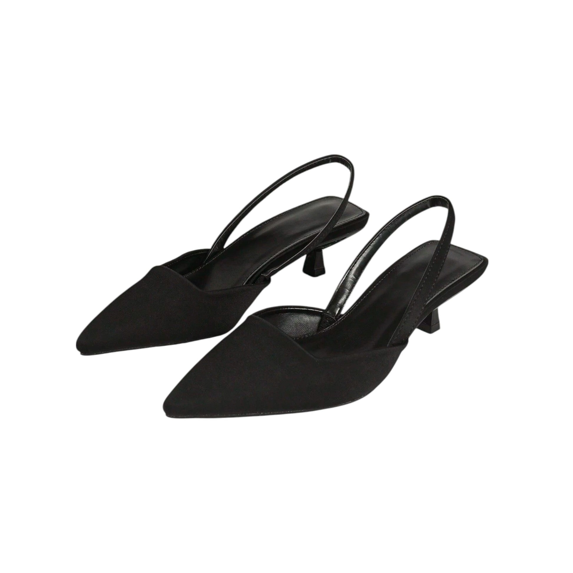Címke nélküli, fekete színű, hegyes orrú szandál, vékony sarokkal és pánttal. Belső talp hossz: 24,5cm