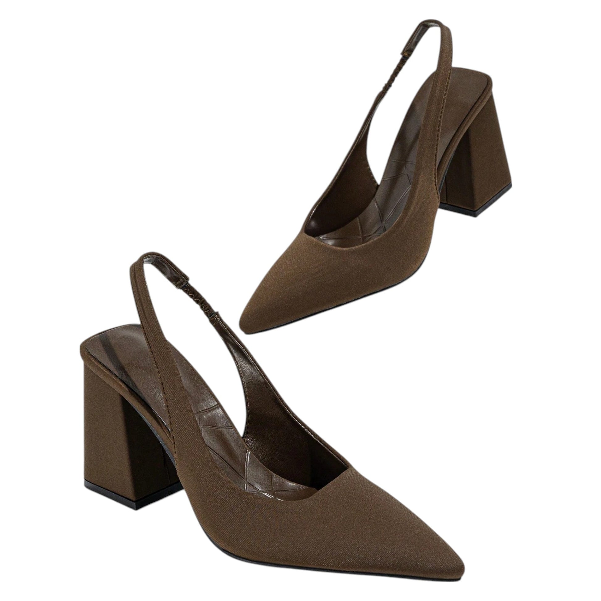 Címke nélküli, barna színű, velúr hatású, magas blokksarkú, hegyes orrú, slingback pánttal.