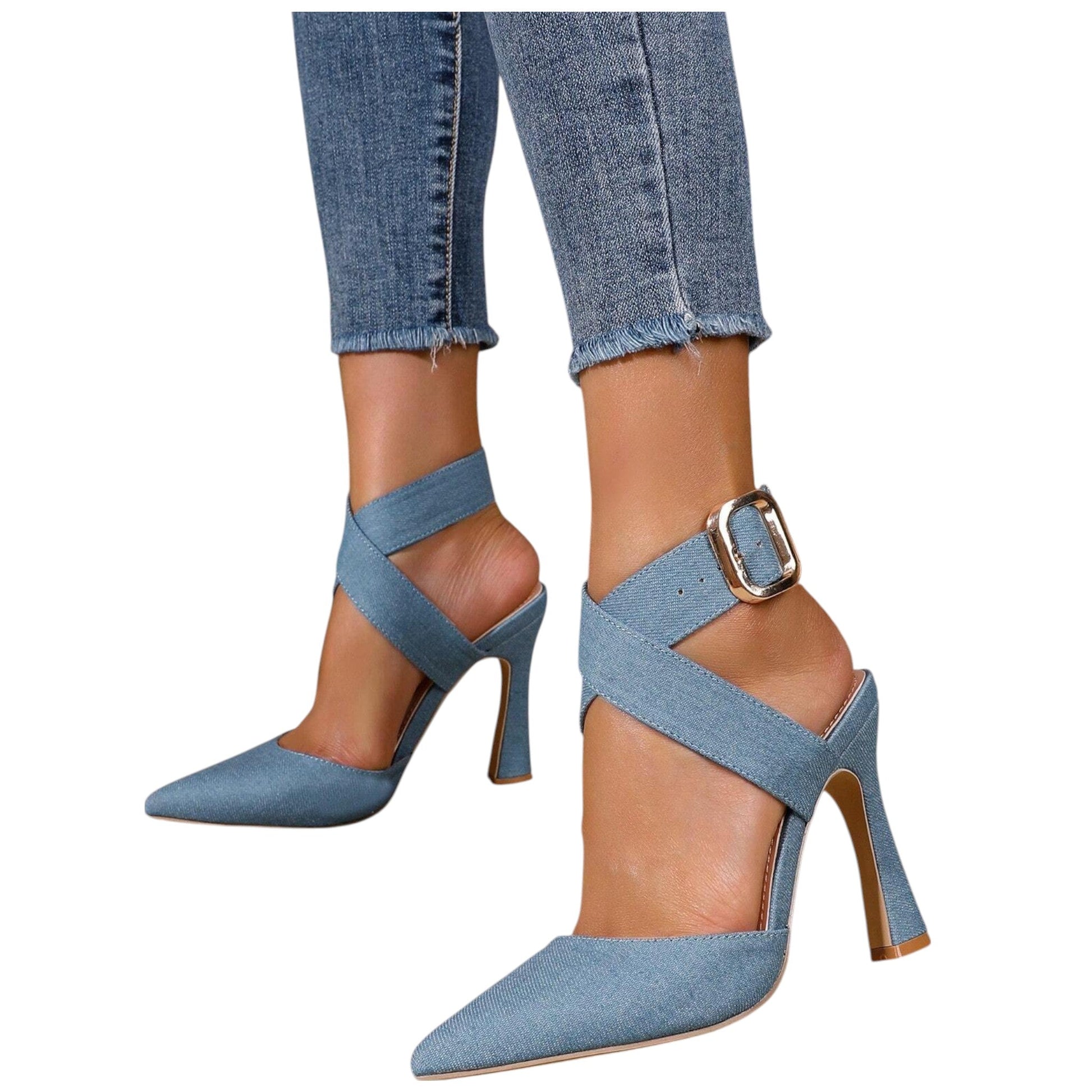 Címke nélküli, világoskék színű, farmer hatású, magas, vastag sarkú, hegyes orrú, keresztbe futó bokapánttal és arany csattal.