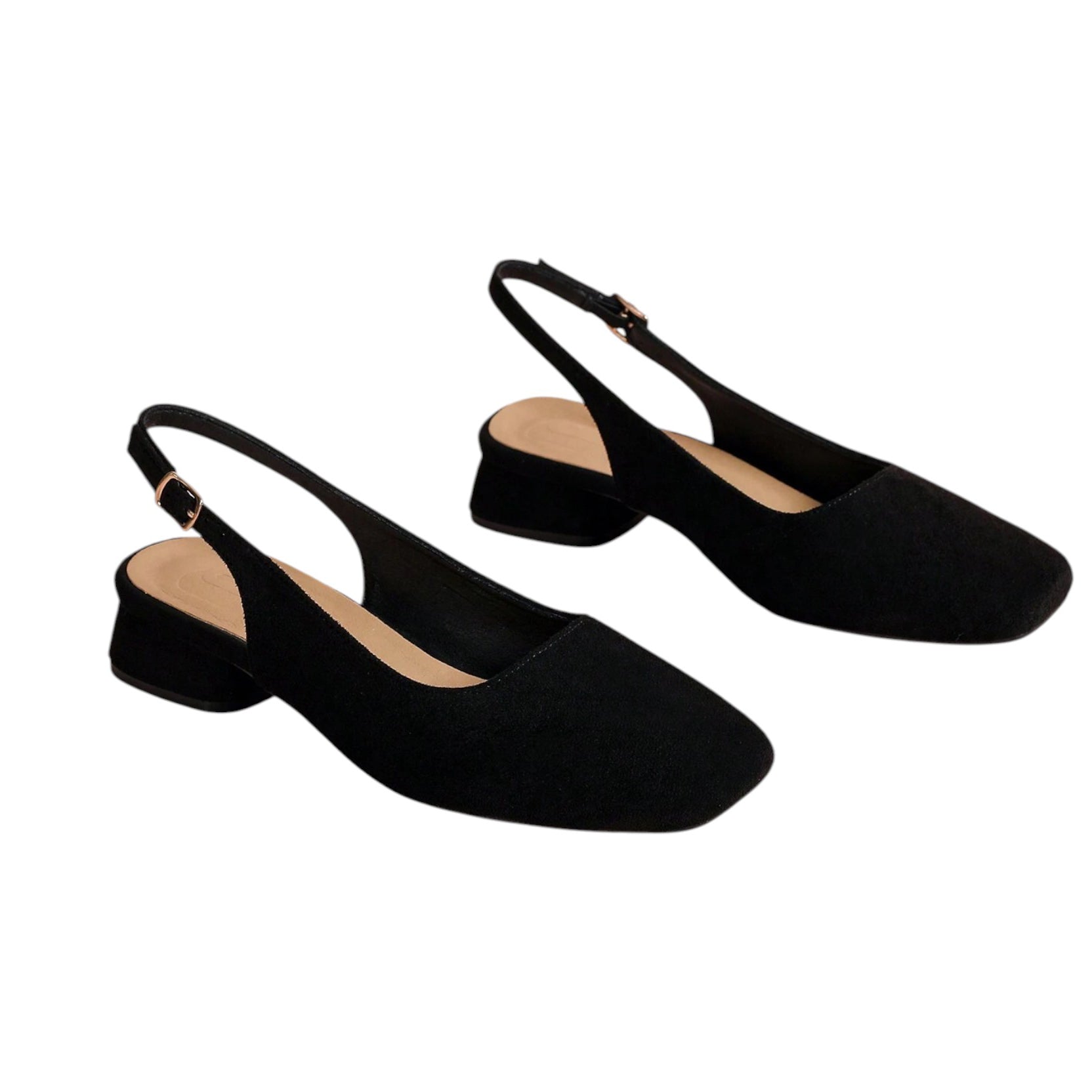 Címke nélküli, fekete, velúr hatású, pántos, blokk sarkú cipő, négyzetes orr-résszel.