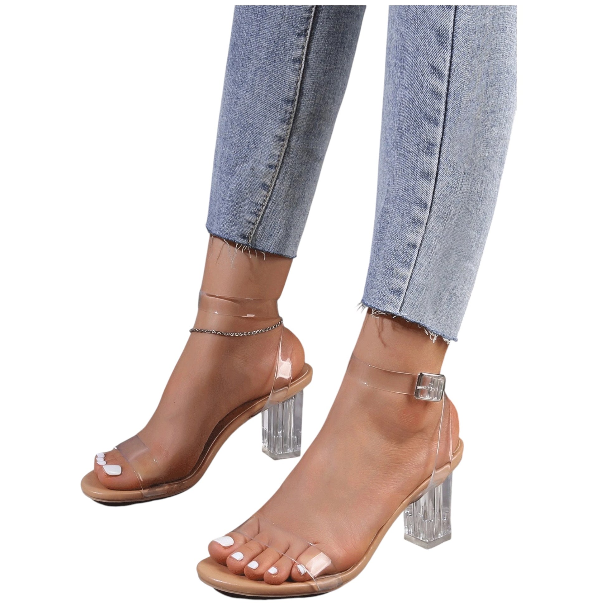 Címke nélküli, áttetsző, magas sarkú szandál, átlátszó pántokkal és vastag, áttetsző sarokkal, csatos bokapánttal.