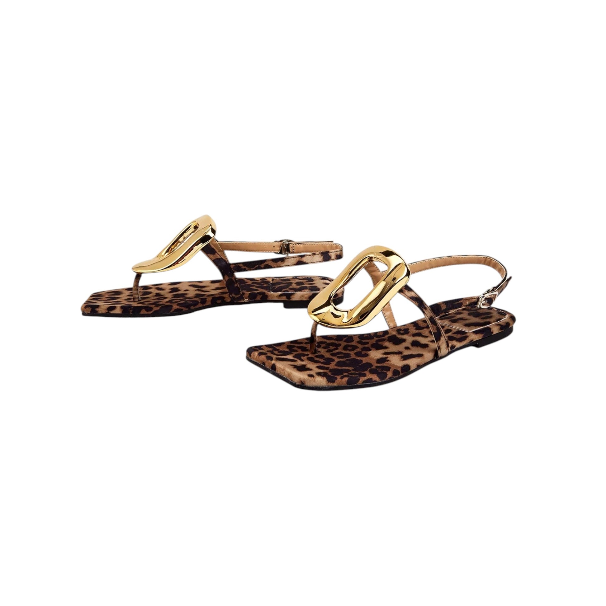 Címke nélküli, leopárd mintás, lapos talpú szandál, szögletes orral, bokapánttal és arany színű csattal. Belső talp hossz: 25cm