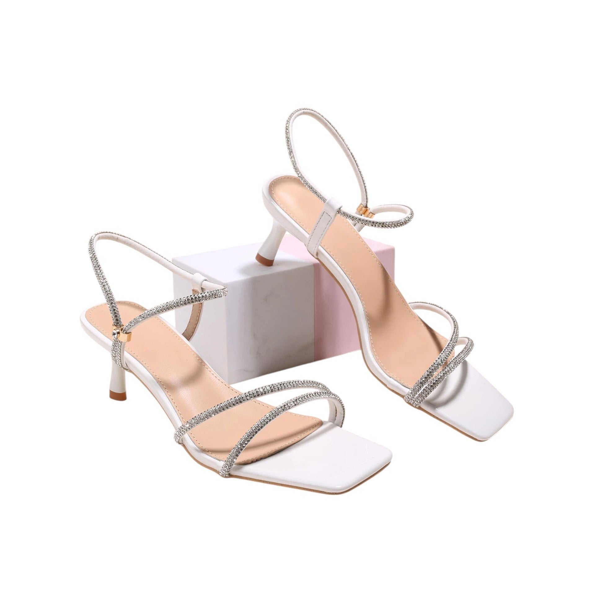 Címke nélküli, fehér, téglalap orrú szandál, vékony strasszos pántokkal, bokapánttal, vékony magas sarokkal.