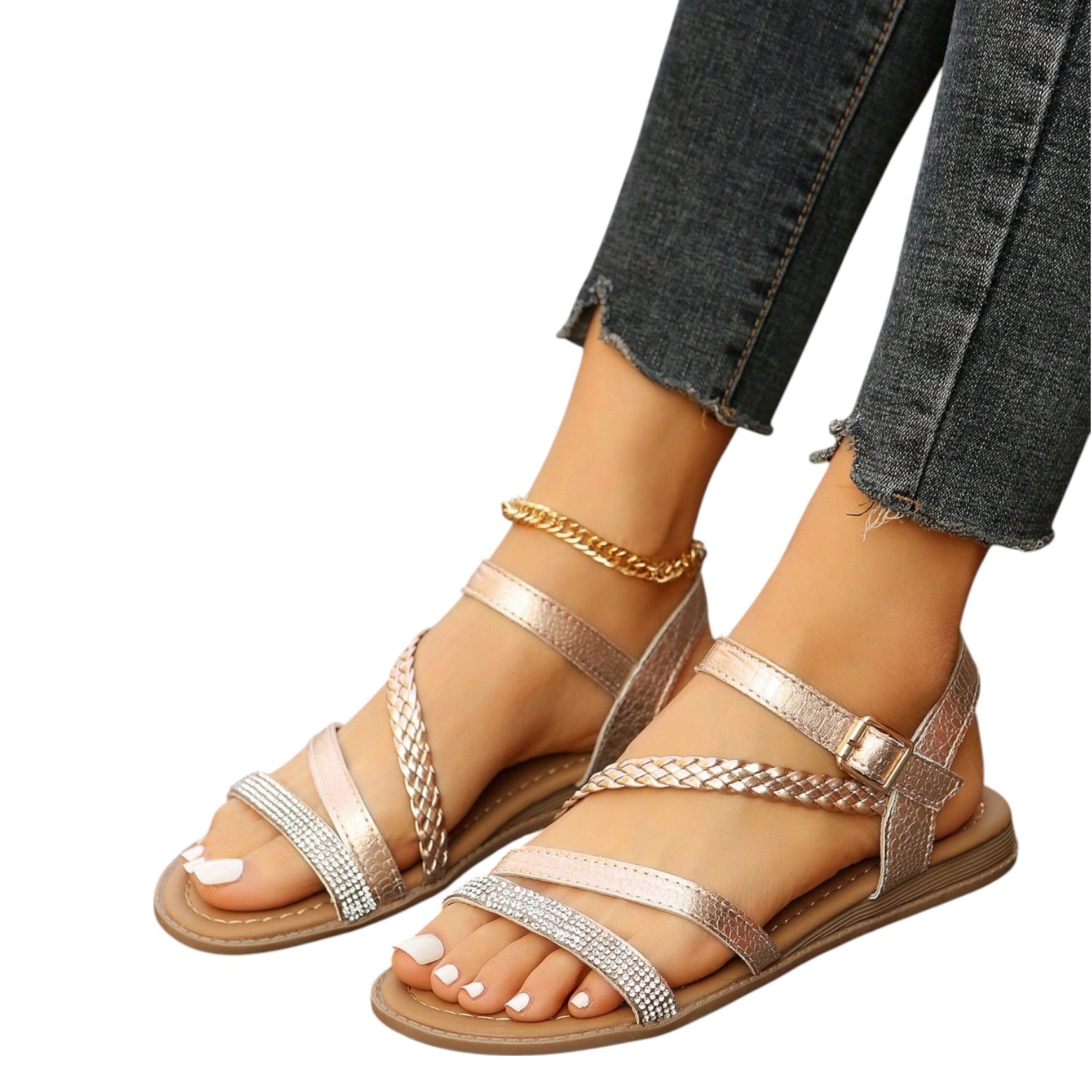 Címke nélküli, rose gold színű, strasszos és fonott pántokkal, bokapánttal és csattal, lapos talpú.