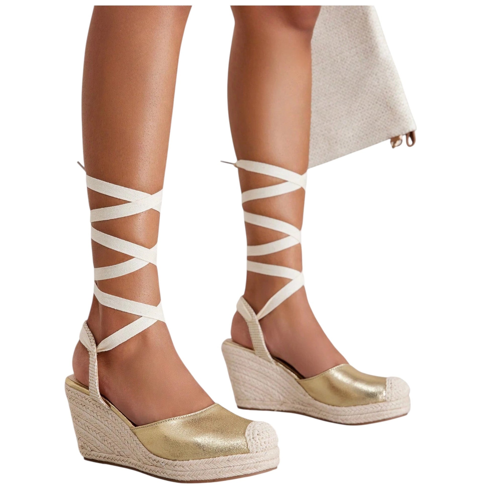 Címke nélküli, arany színű, fonott éktalpú, kerek orrú, bokára tekerhető fűzős pántokkal.