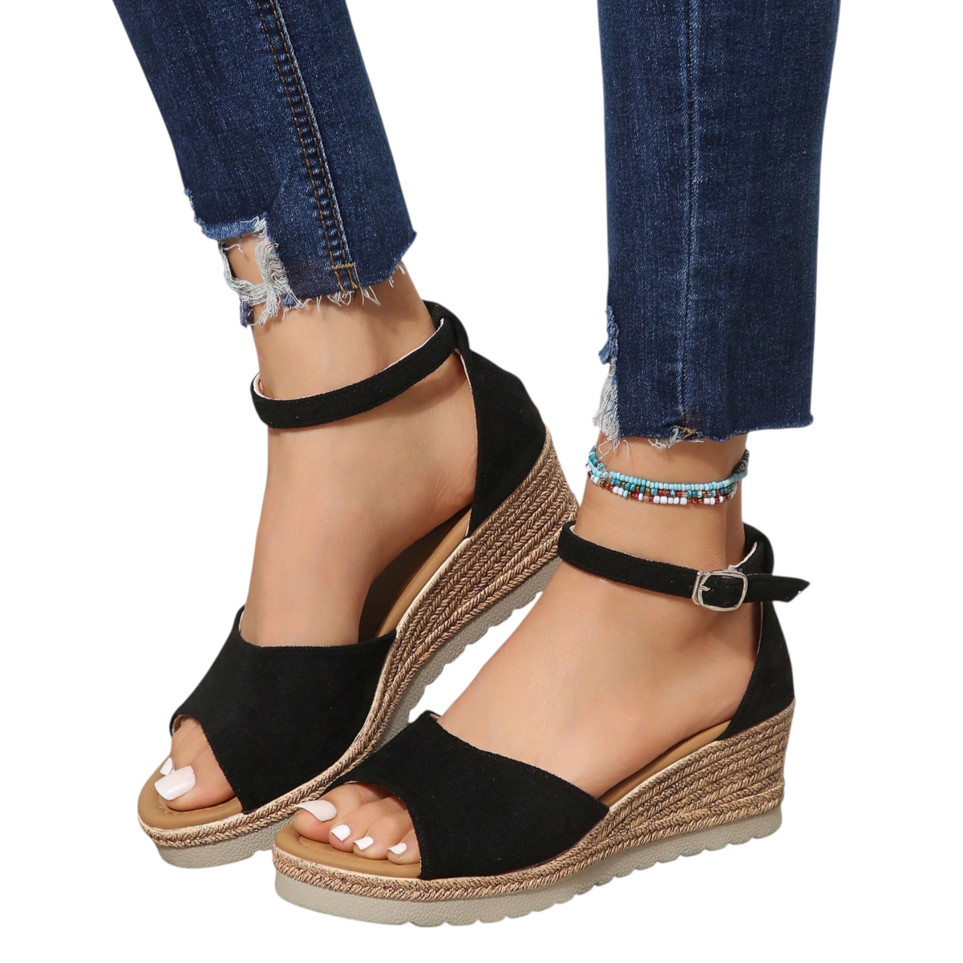Címke nélküli, fekete, telitalpú, fonott hatású talprész, bokapántos, nyitott orrú.