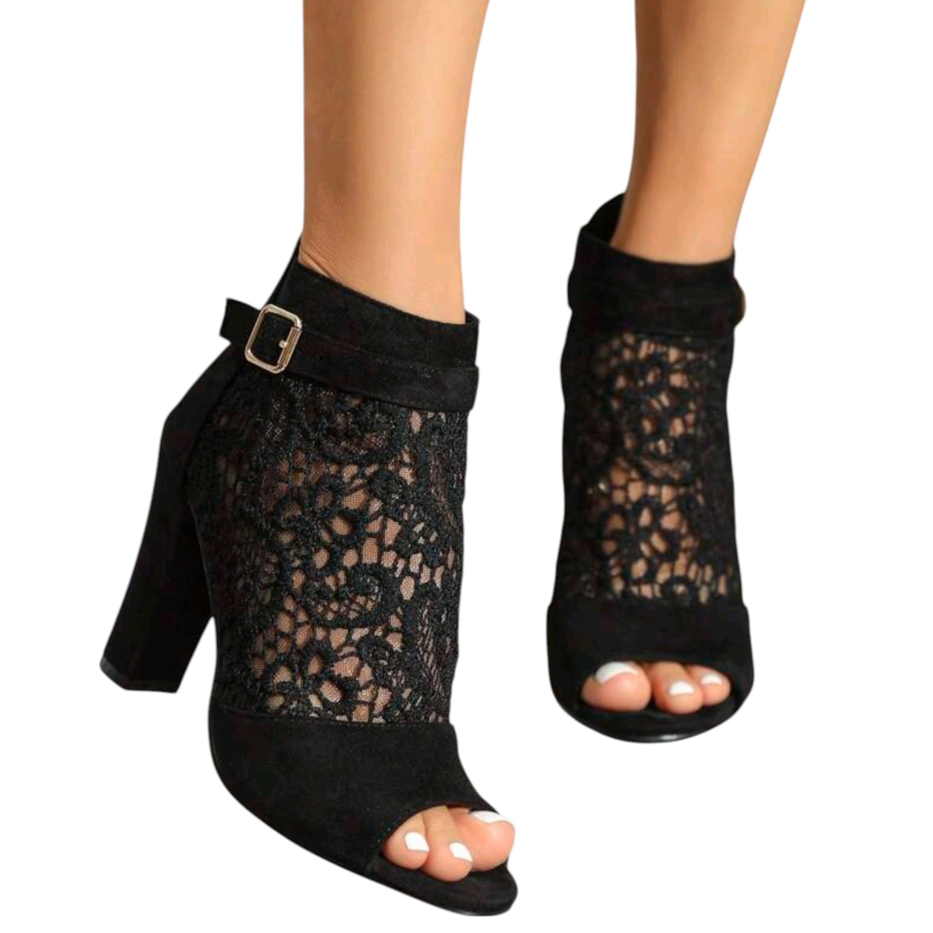 Címke nélküli, fekete, nyitott orrú, csipkés betétes, blokksarkú, bokapántos bokacsizma. Belső talp hossz: 24,5cm