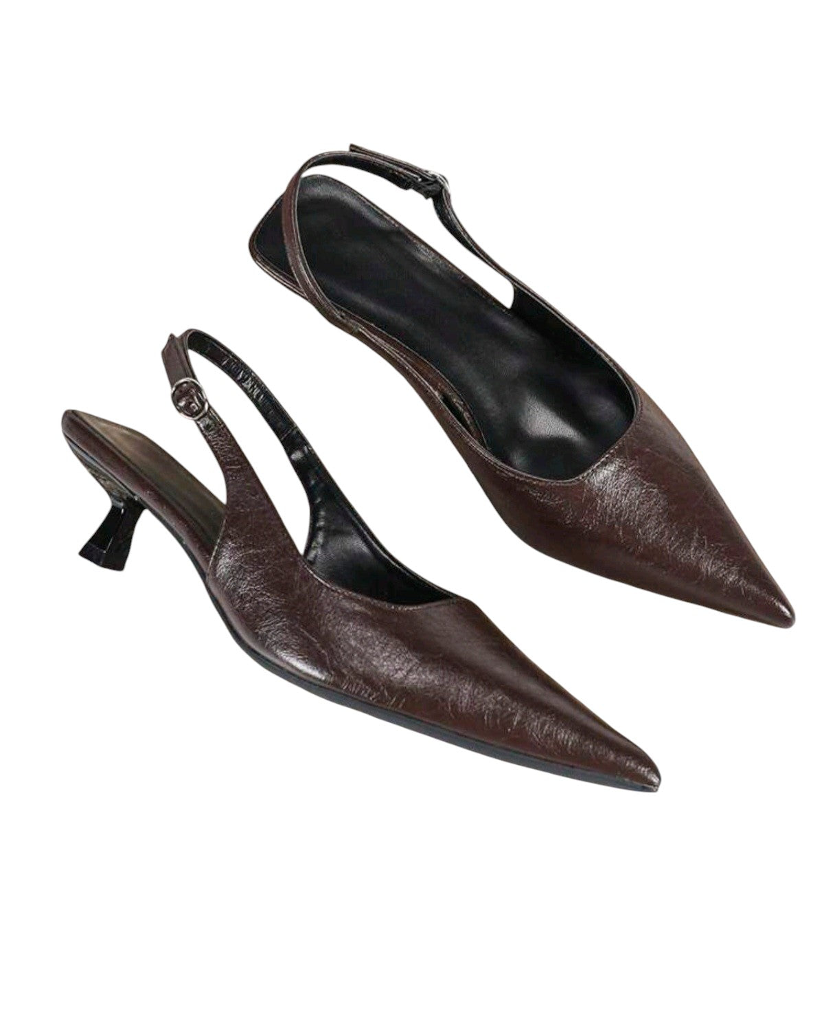 Címke nélküli, barna, műbőr, heeled slingbacks, hegyes orrú, kitten sarokkal. Belső talp hossz: 26cm