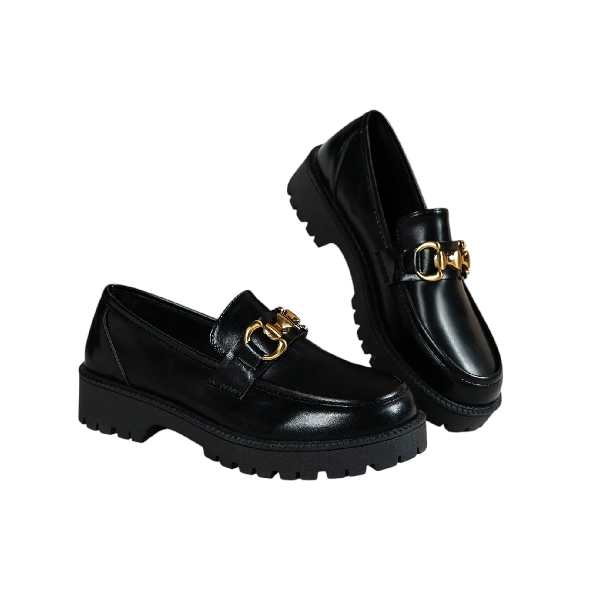 Címke nélküli, fekete, vastag platform talpú loafer cipő lakkbőr hatású anyagból, hangsúlyos varrásokkal. Belső talp hossz: 24,5cm