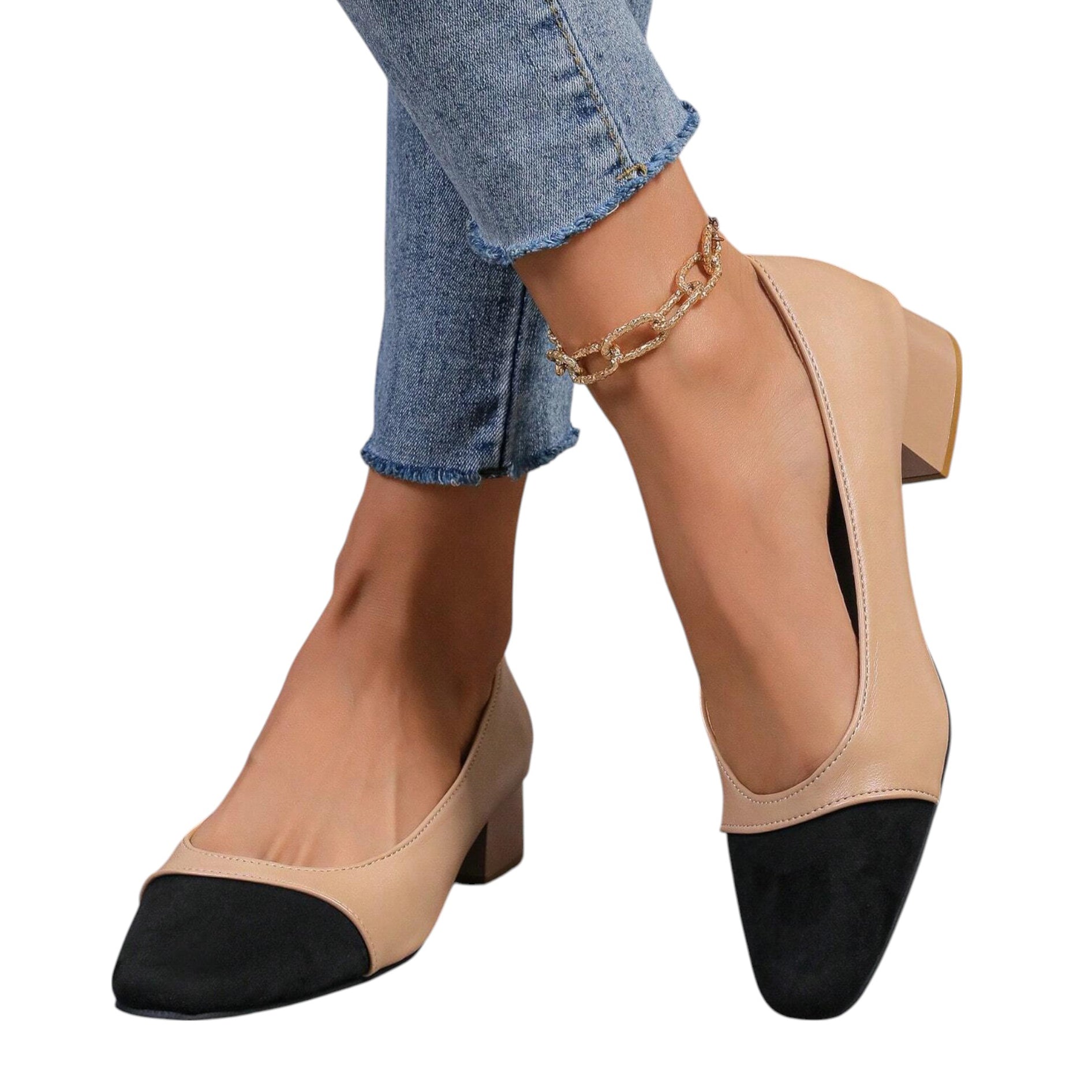 Címke nélküli, bézs és fekete, kétszínű, szögletes orr, tömb sarok, boka feletti rész.