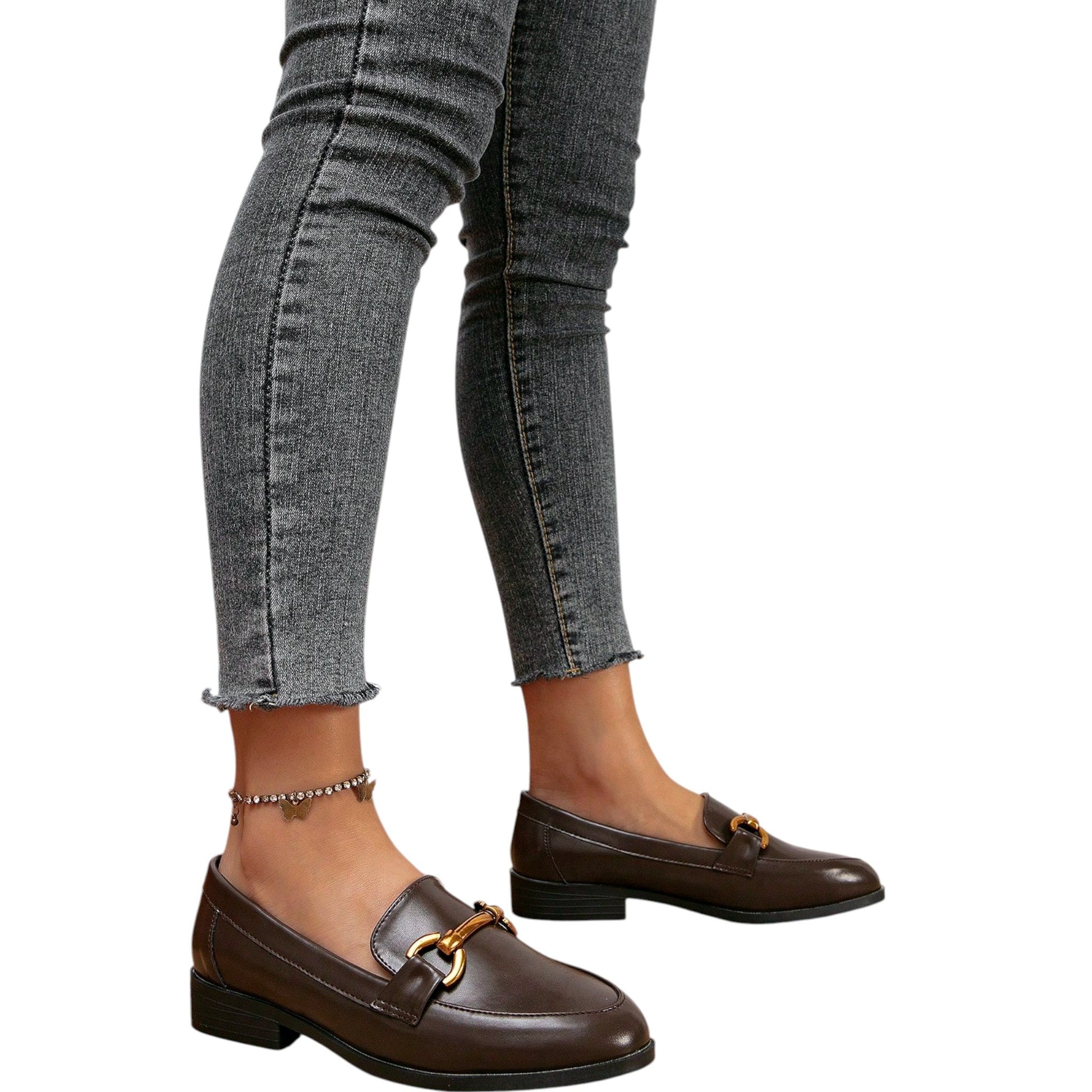 Címke nélküli, barna, klasszikus loafer, arany színű dekoratív csattal.