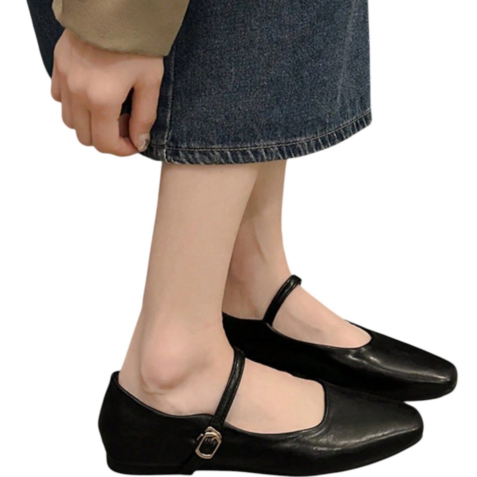 Címke nélküli, fekete színű, lapos talpú, hegyes orrú, vékony bokapánttal és csattal.