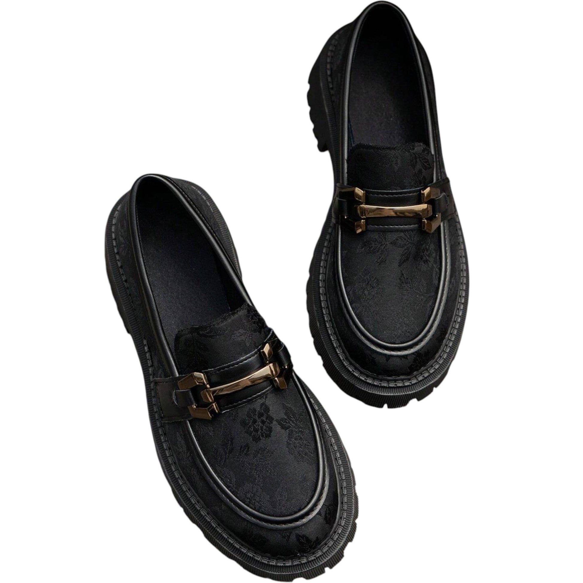 Címke nélküli, fekete, virágmintás, vastag platform talpú, láncos díszítésű bebújós loafer cipő.