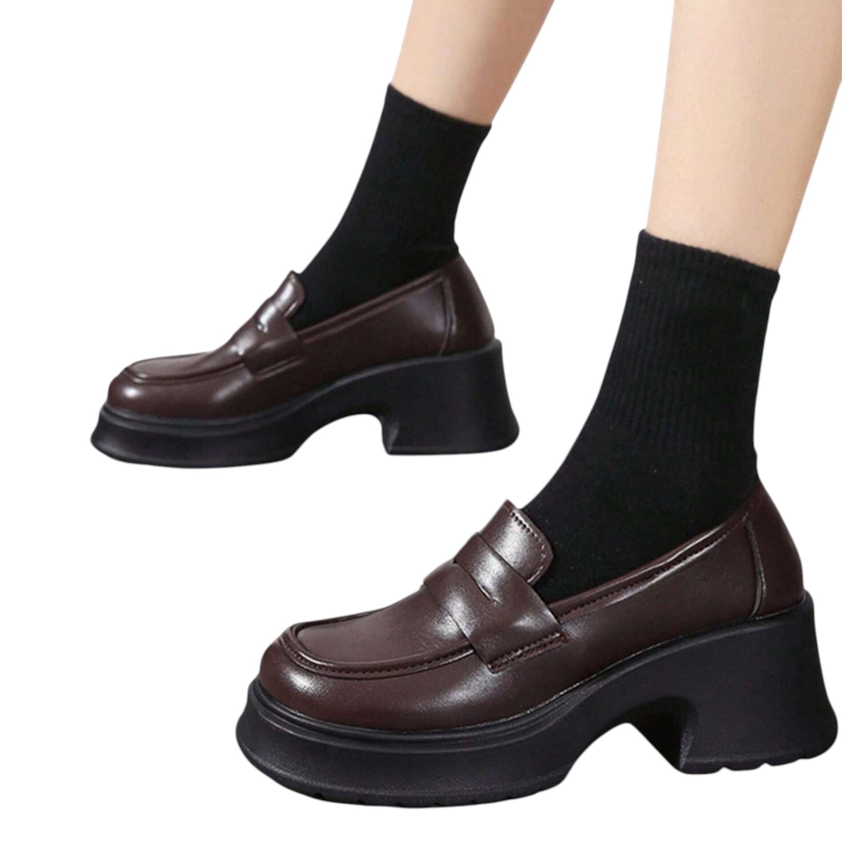 Címke nélküli, barna, vastag platform talpú, bebújós loafer cipő, széles sarokkal.