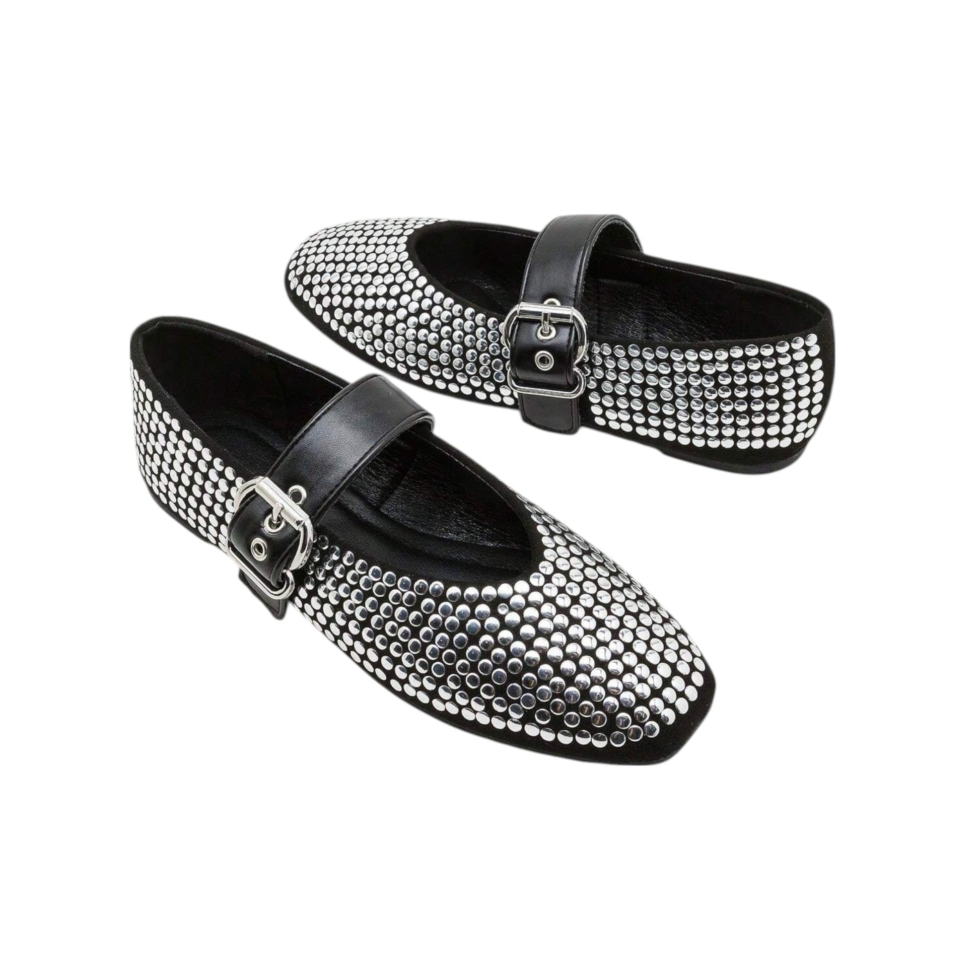 Címke nélküli, fekete és ezüst, szegecses díszítés, pántos, csatos, kerek orr, lapos talp.
