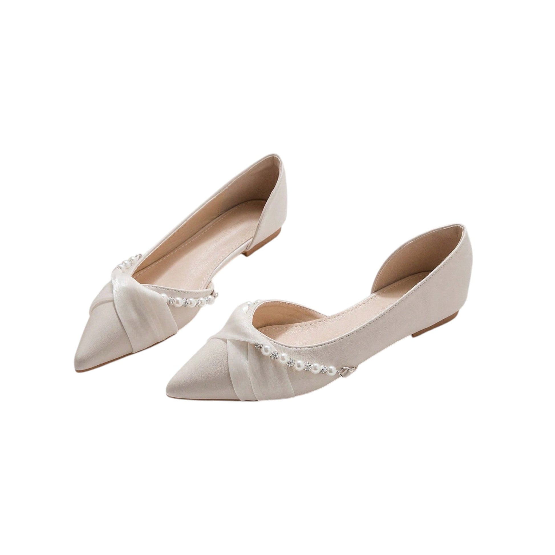Címke nélküli, ekrü, hegyes orrú, gyöngyös, elől szalag díszítéssel, kivágott oldalú, lapos talpú. Belső talp hossz: 23cm