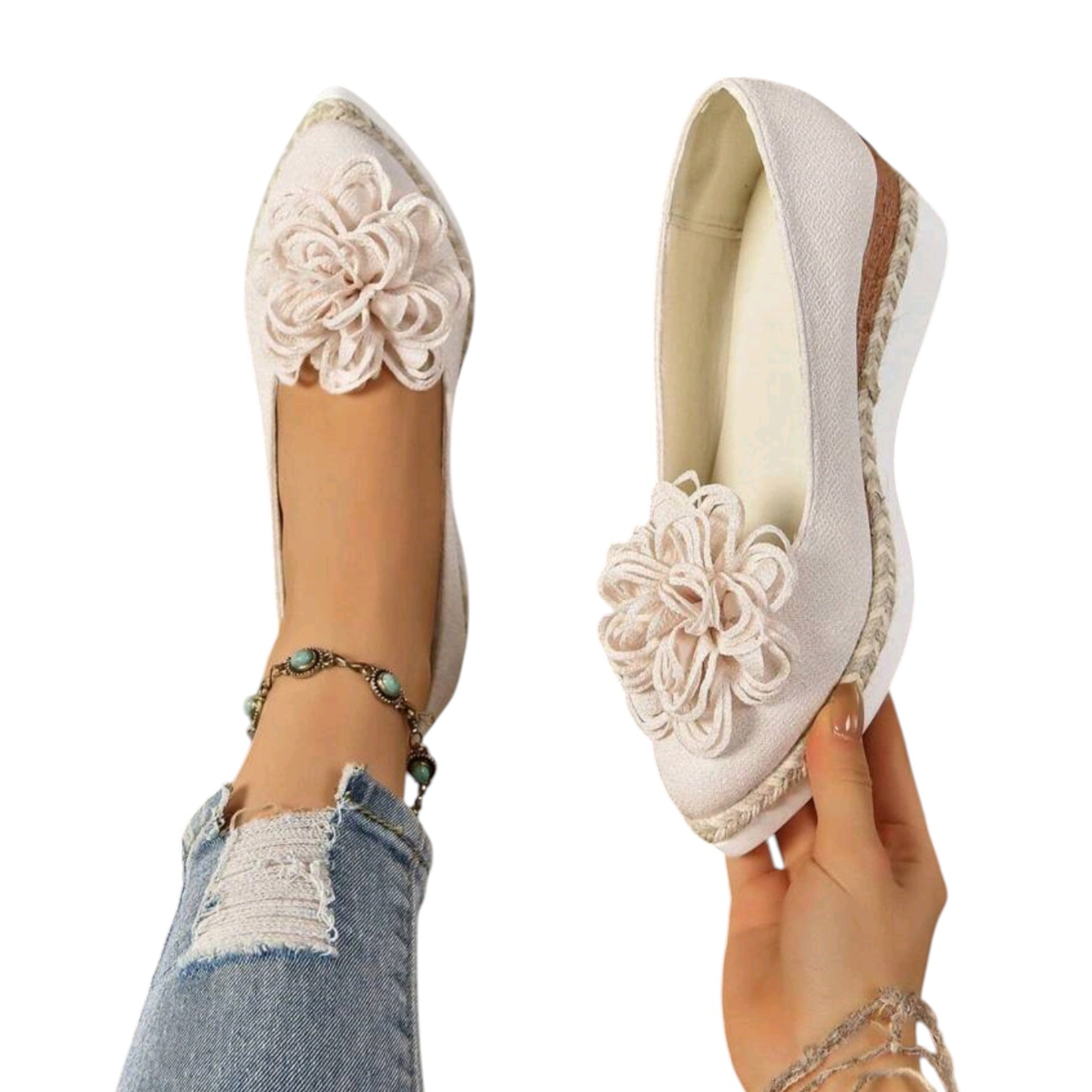 Címke nélküli, törtfehér, hegyesorrú, platform talpú, virágdíszes, espadrille hatású cipő. Belső talp hossz: 26cm
