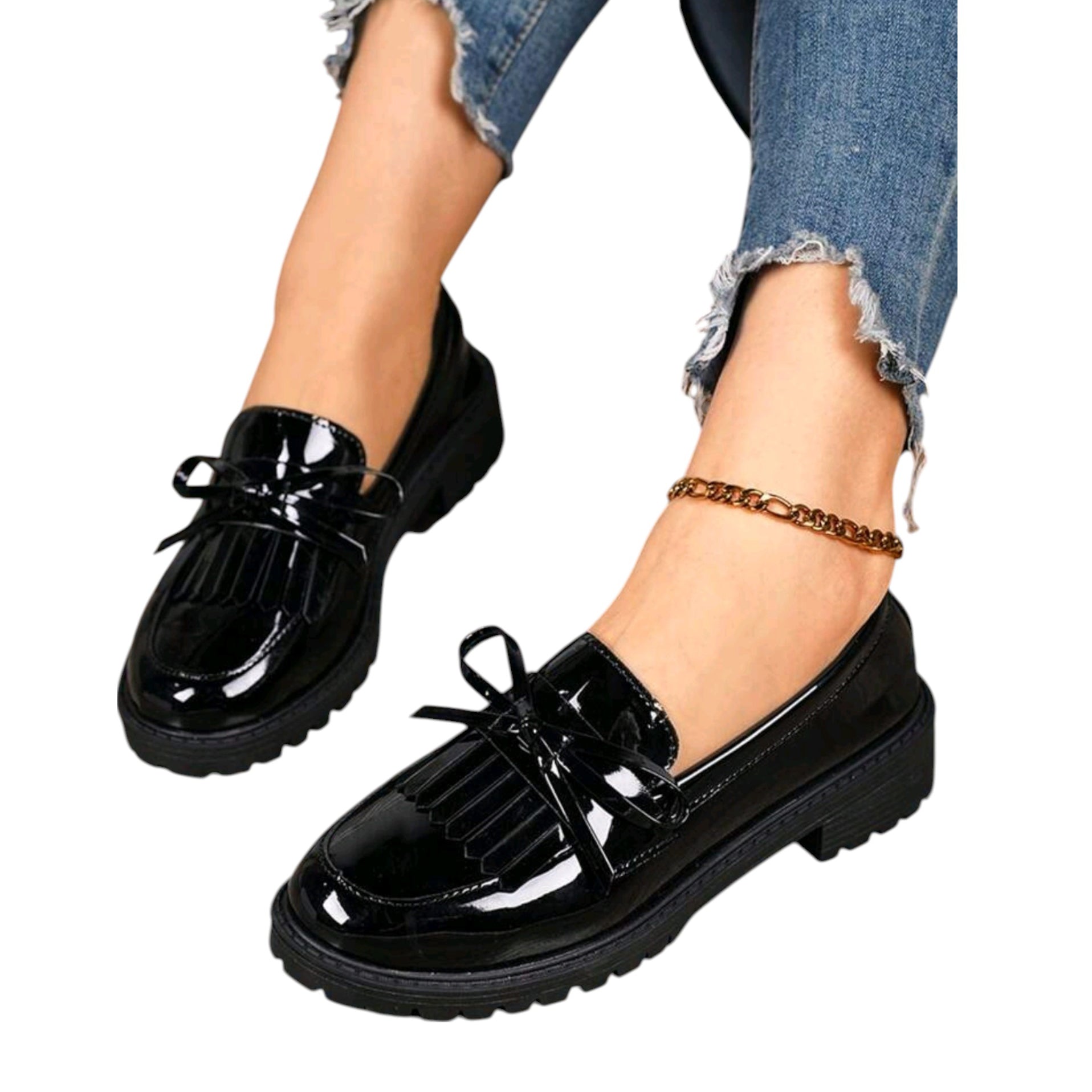 Címke nélküli, fekete, fényes, vastag talpú, rojtokkal és masnival díszített mokaszin. Belső talp hossz: 24,5cm