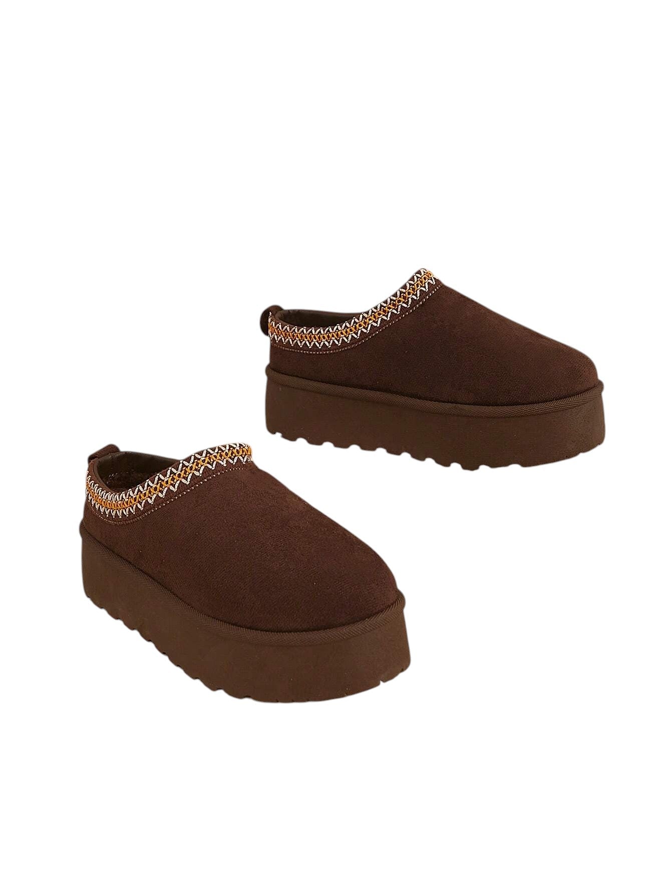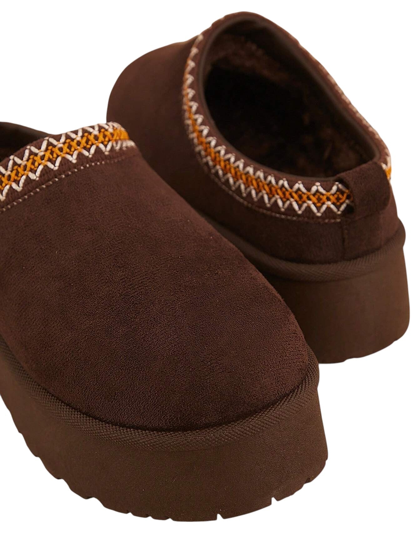 Címke nélküli, barna, kerek orrú, platform talpú, díszített szegélyű papucs. Belső talp hossz: 25cm