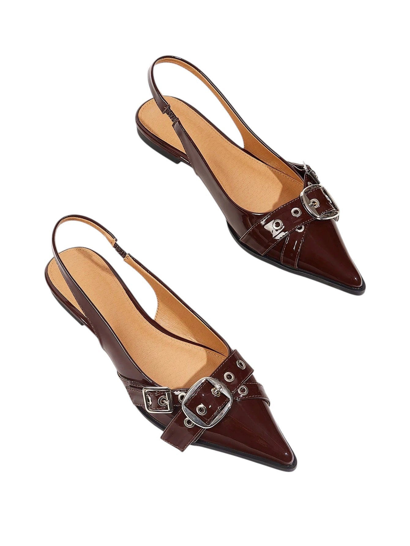 Címke nélküli, bordó lakk, hegyes orrú, slingback fazonú, alacsony sarkú magassarkú cipő csattal díszítve