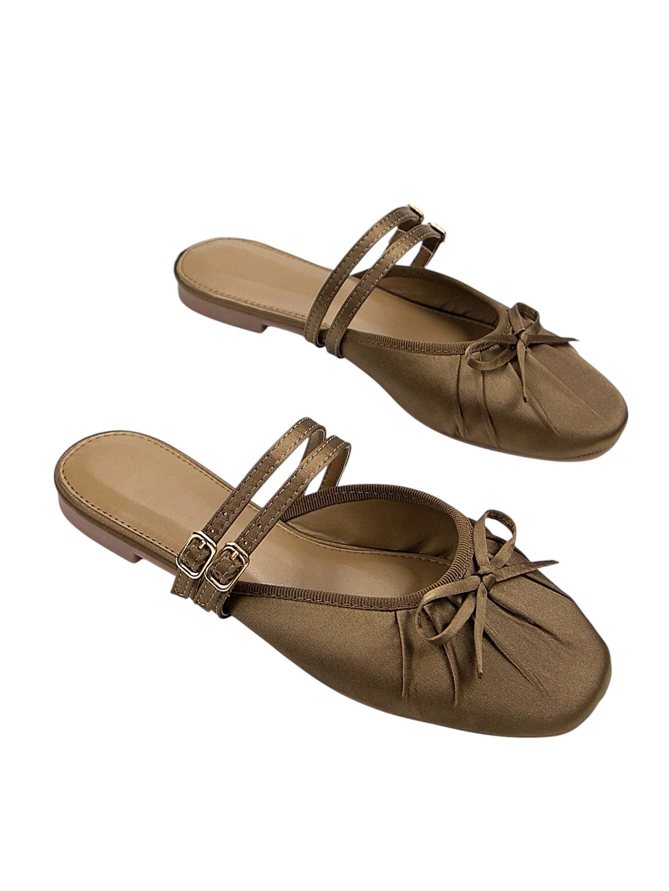 Címke nélküli, barna szatén, kerek orrú, dupla pántos, masnival díszített lapos balerina