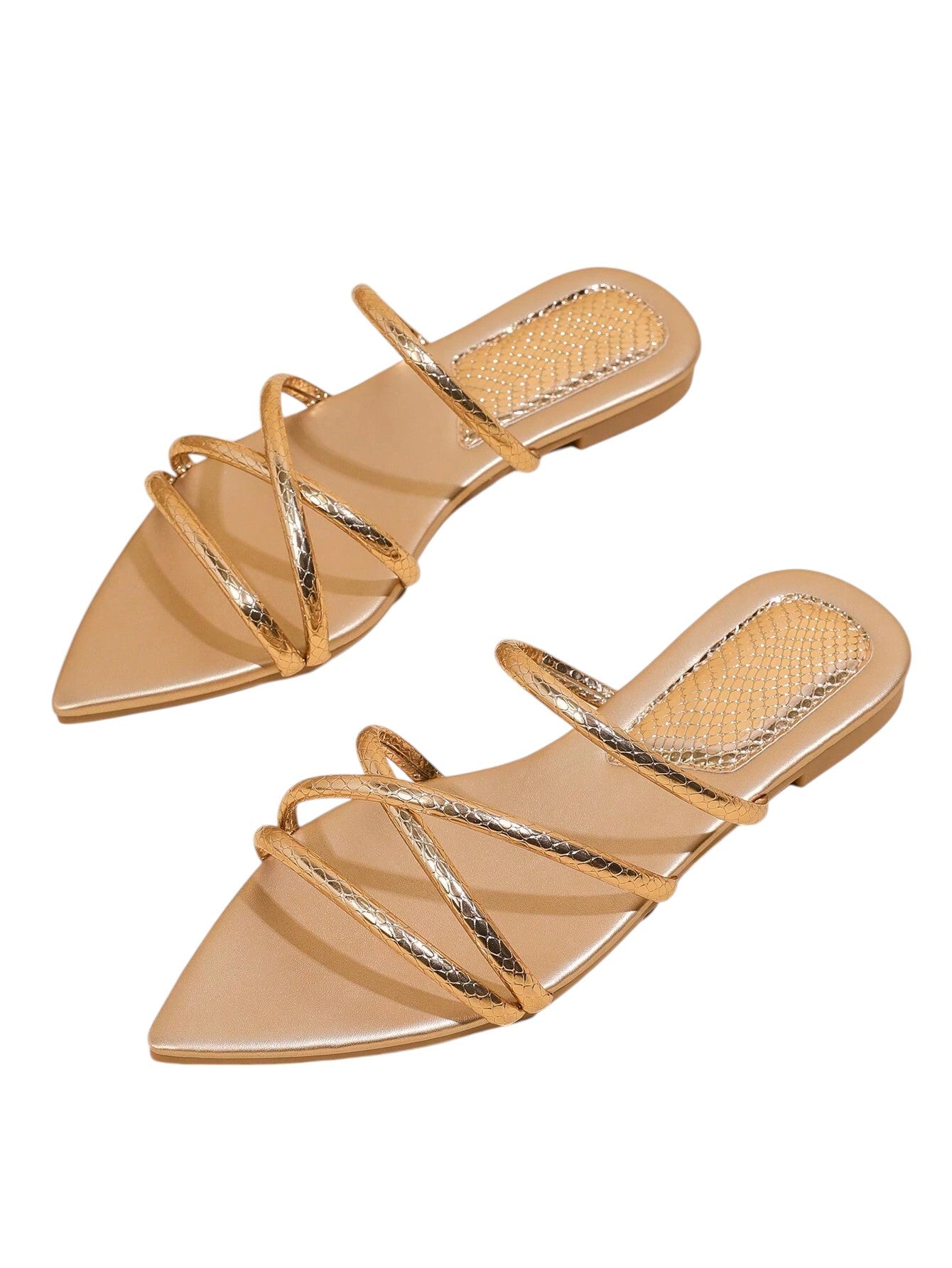 Címke nélküli, bézs műbőr, hegyes orrú, több vékony pánttal díszített bebújós papucs