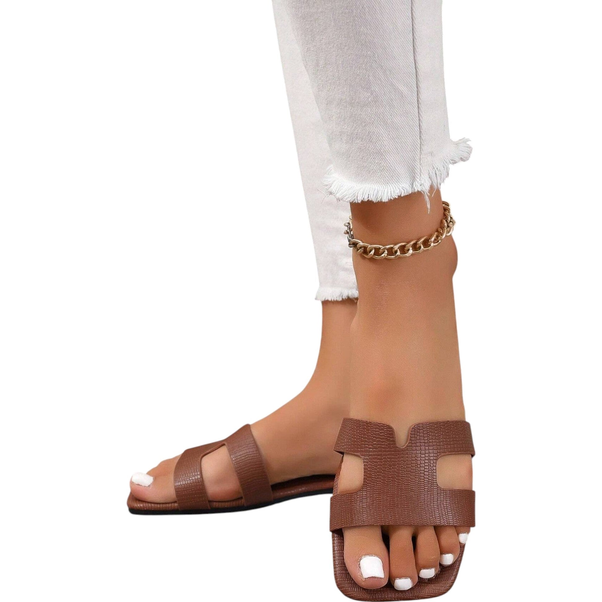 Címke nélküli, barna, széles pántokkal, lapos talpú. Belső talp hossz: 25cm