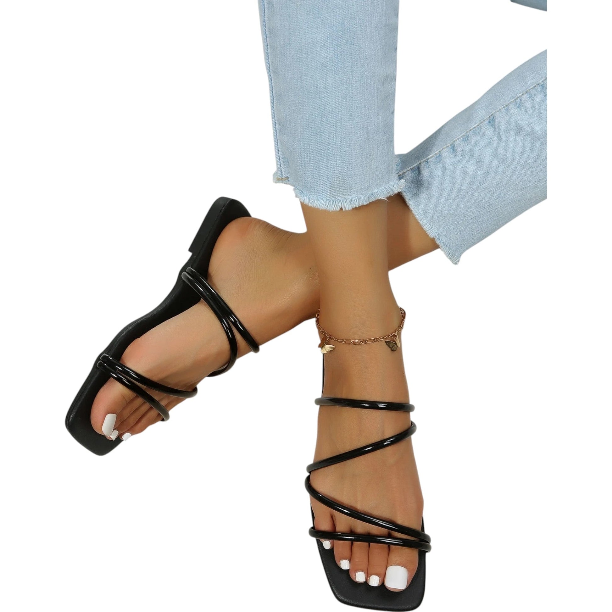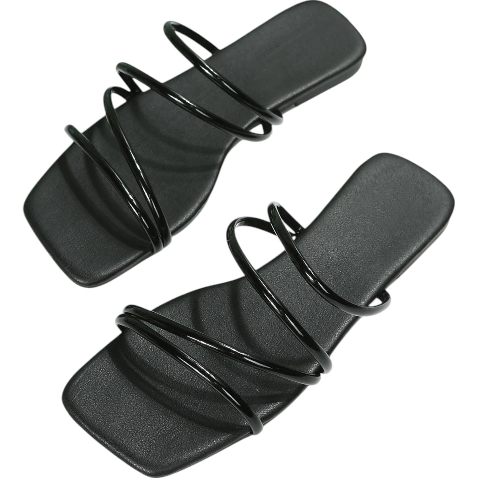 Címke nélküli, fekete színű, lapos talpú, vékony pántos papucs. Kényelmes és divatos viselet a nyári napokra. Belső talp hossz: 23,6cm