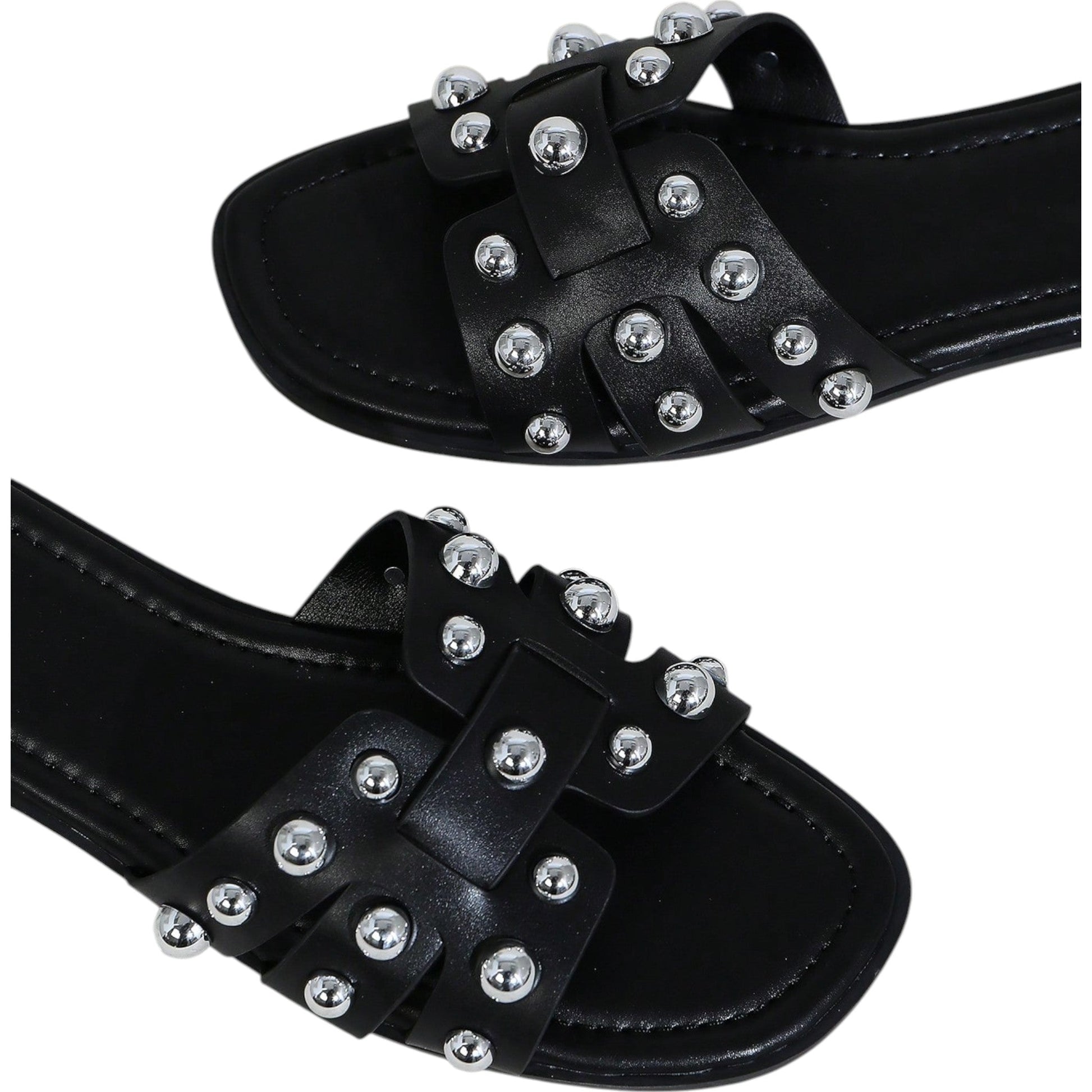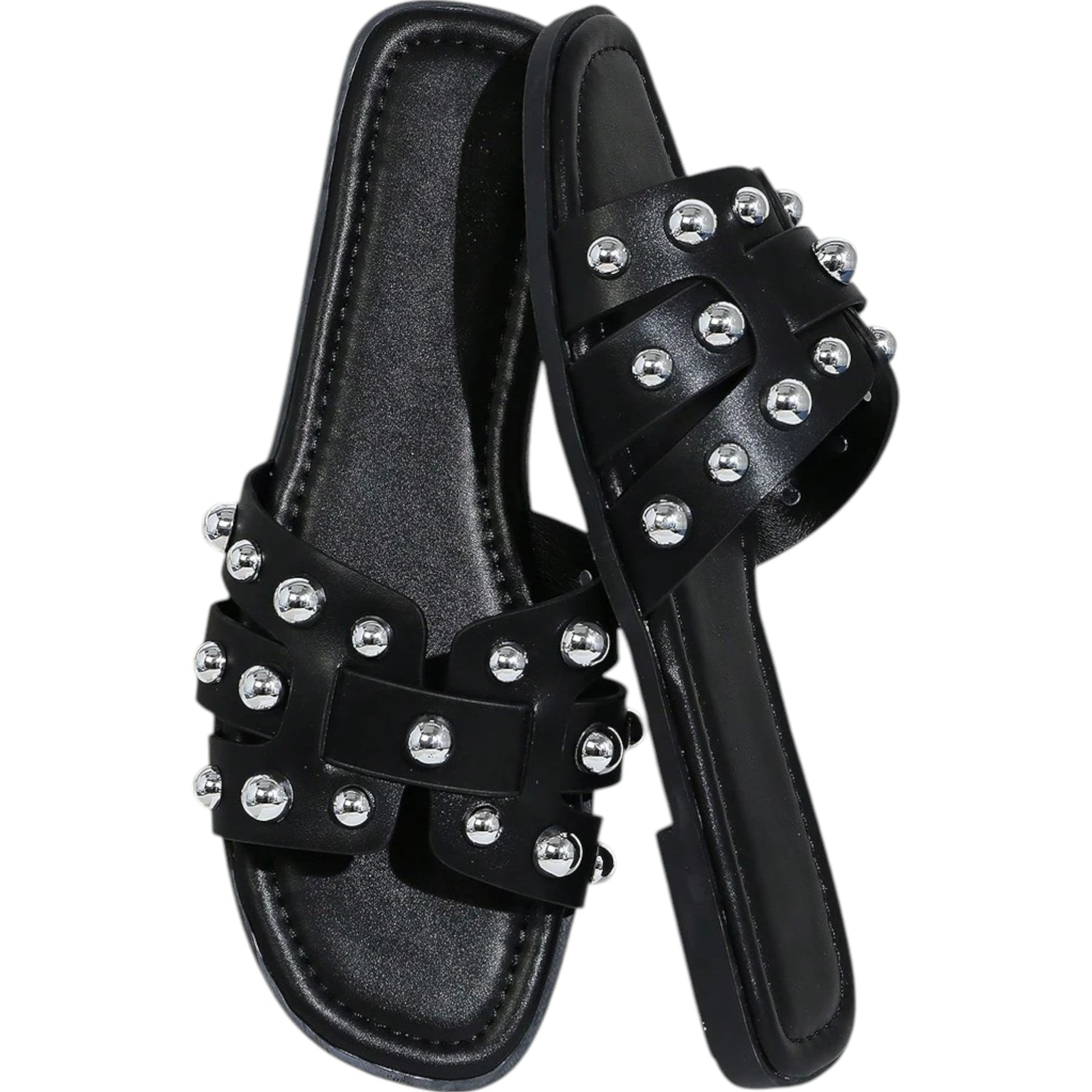 Címke nélküli, fekete, szegecsekkel díszített pántokkal, lapos talpú. Belső talp hossz: 24cm