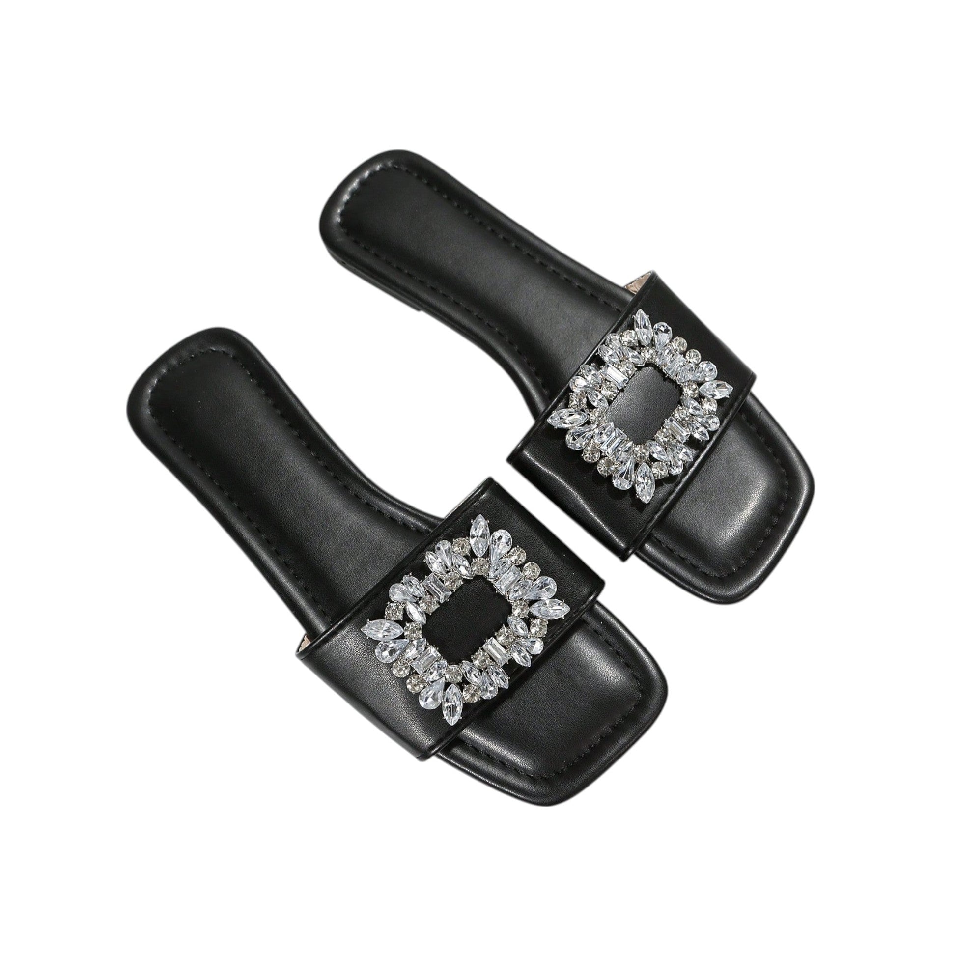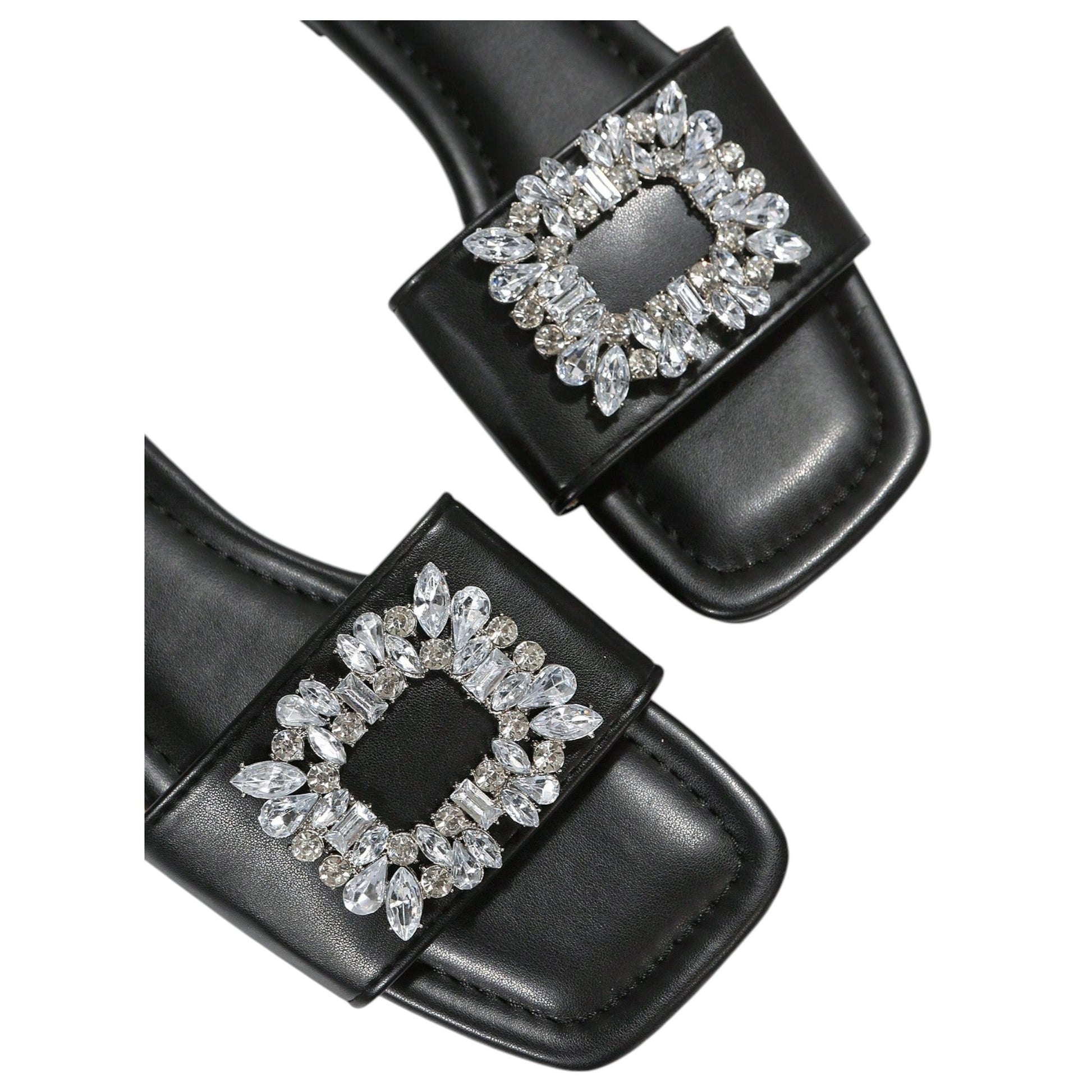 Címke nélküli, fekete, széles pántos papucs, melyet strasszokkal díszítettek.