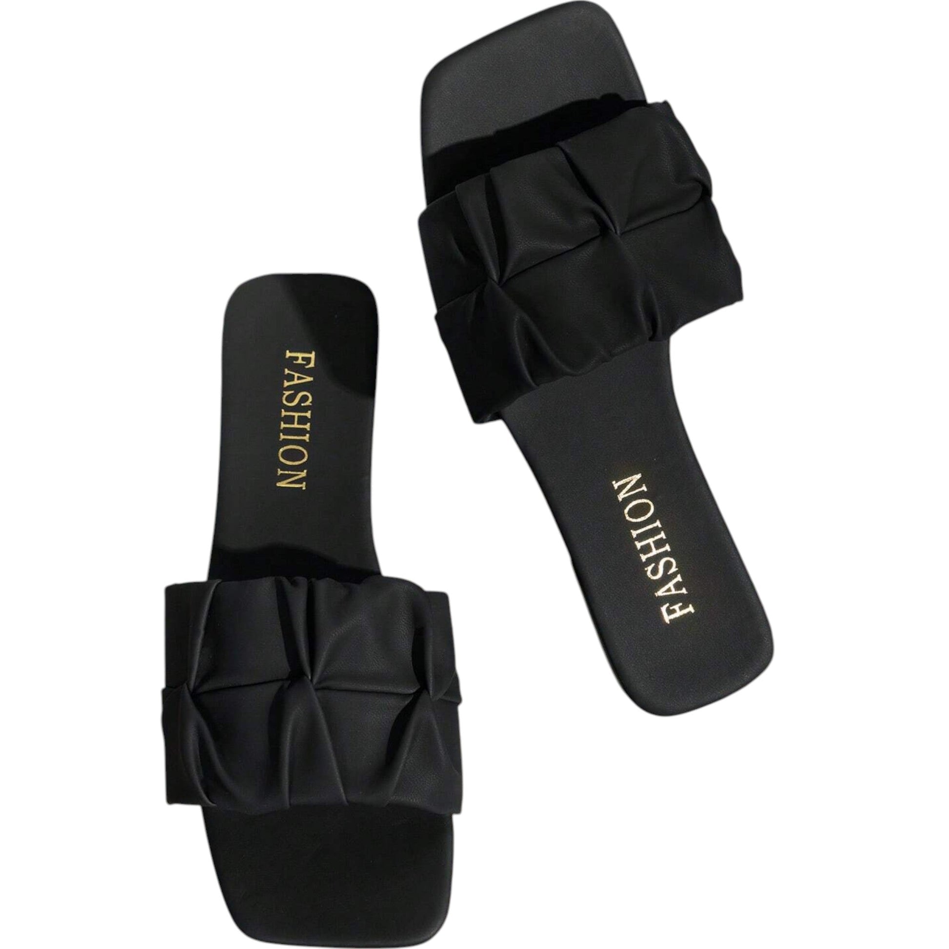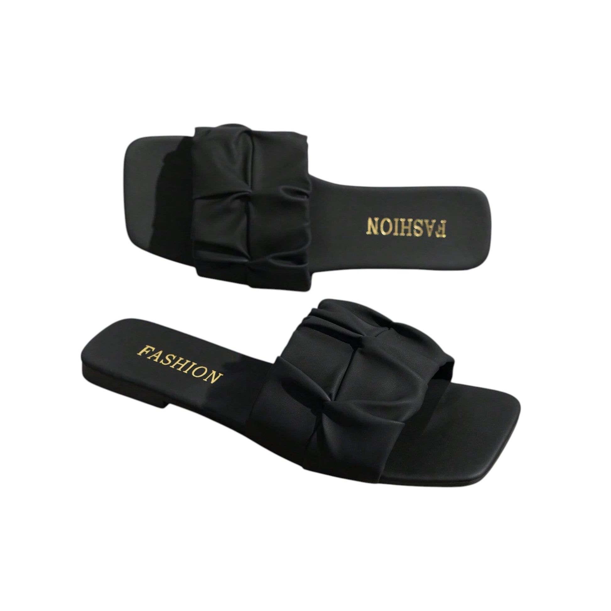 Címke nélküli, fekete, négyzet orrú, ráncolt masnival díszített, lapos talpú papucs. Belső talp hossz: 24cm