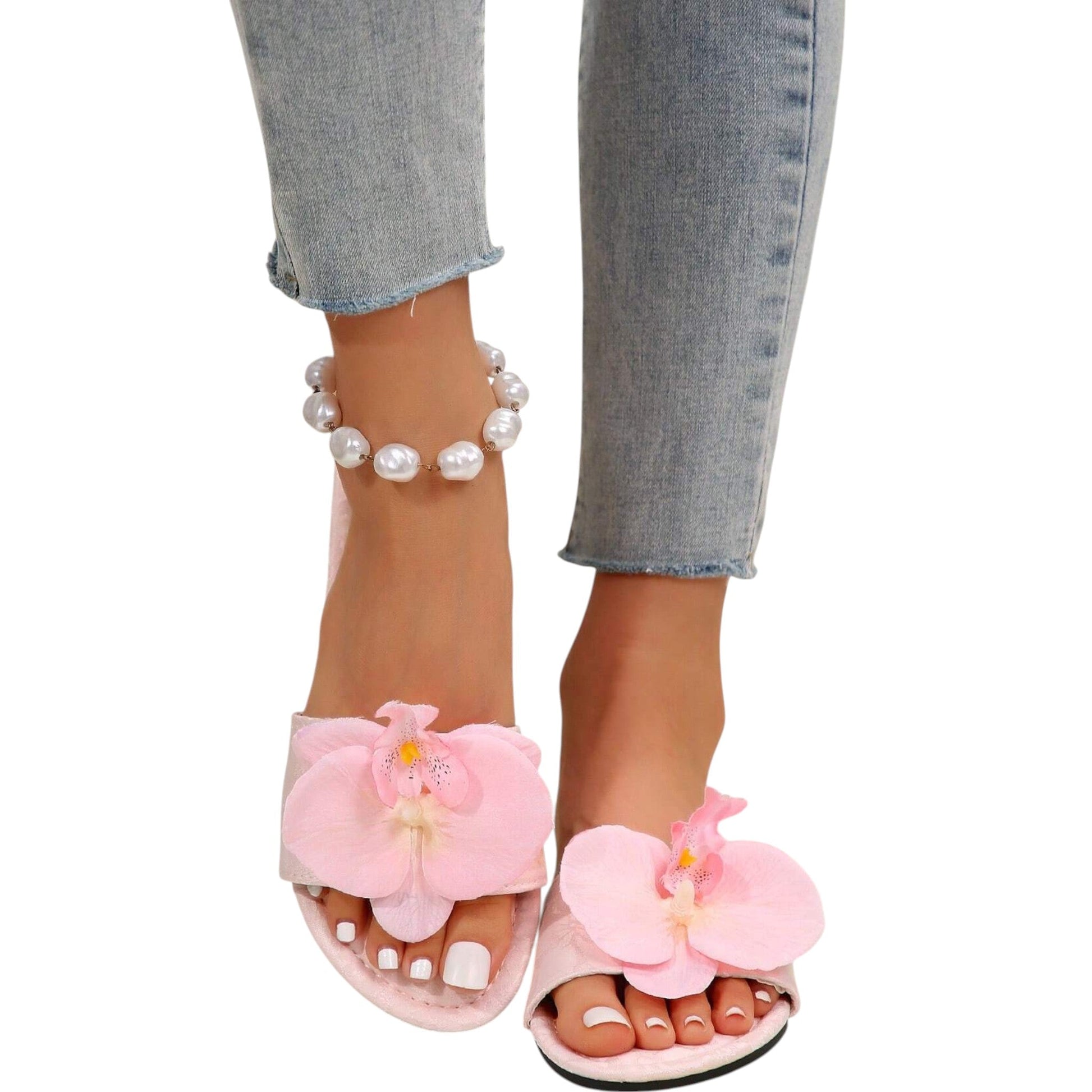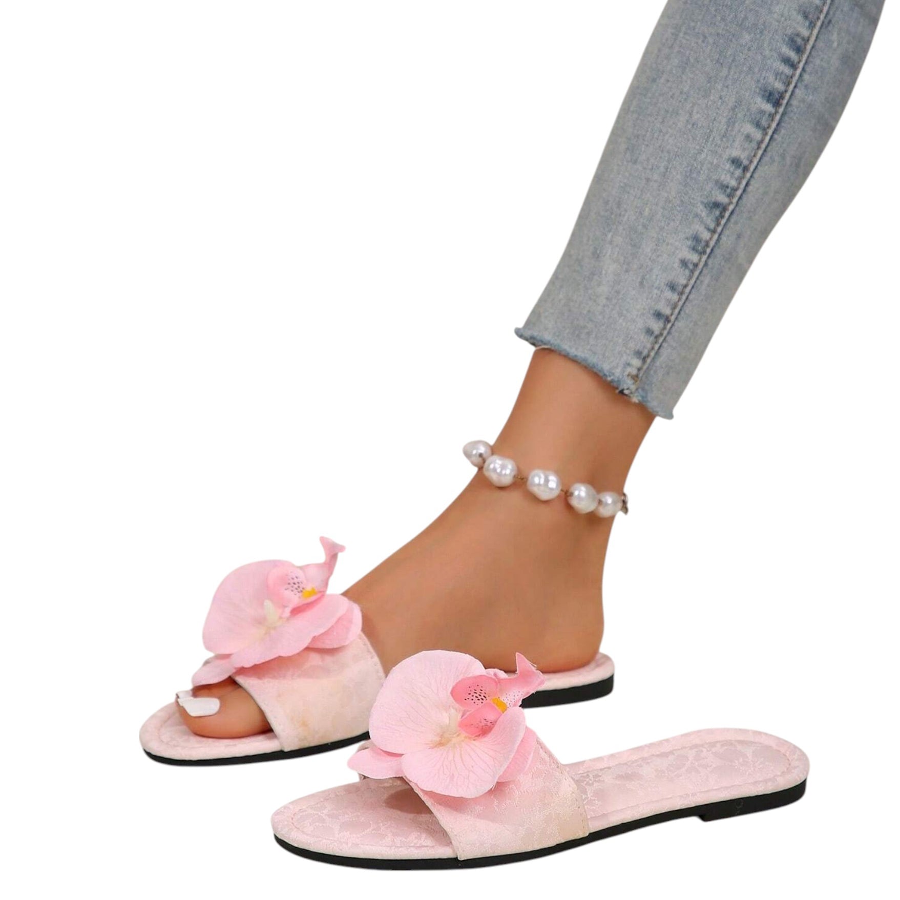 Címke nélküli, rózsaszín színű, nyitott orrú papucs, virágokkal díszítve és lapos talppal. Belső talp hossz: 23,5cm