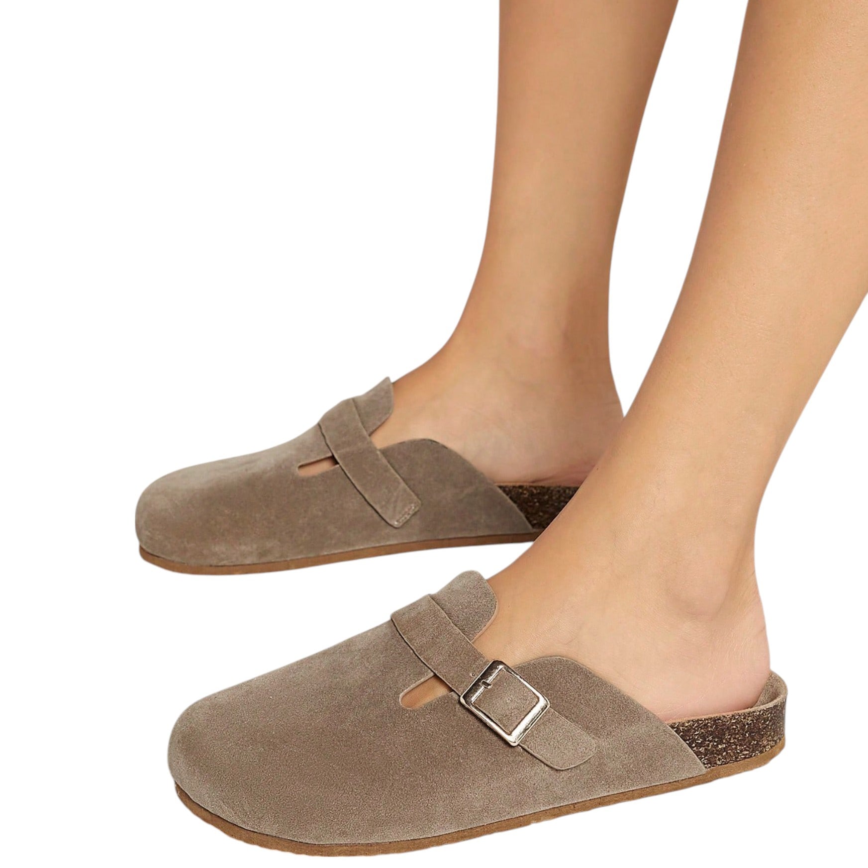 Címke nélküli, bézs színű, velúr hatású, nyitott sarkú, parafa hatású talppal, csatos díszítéssel.