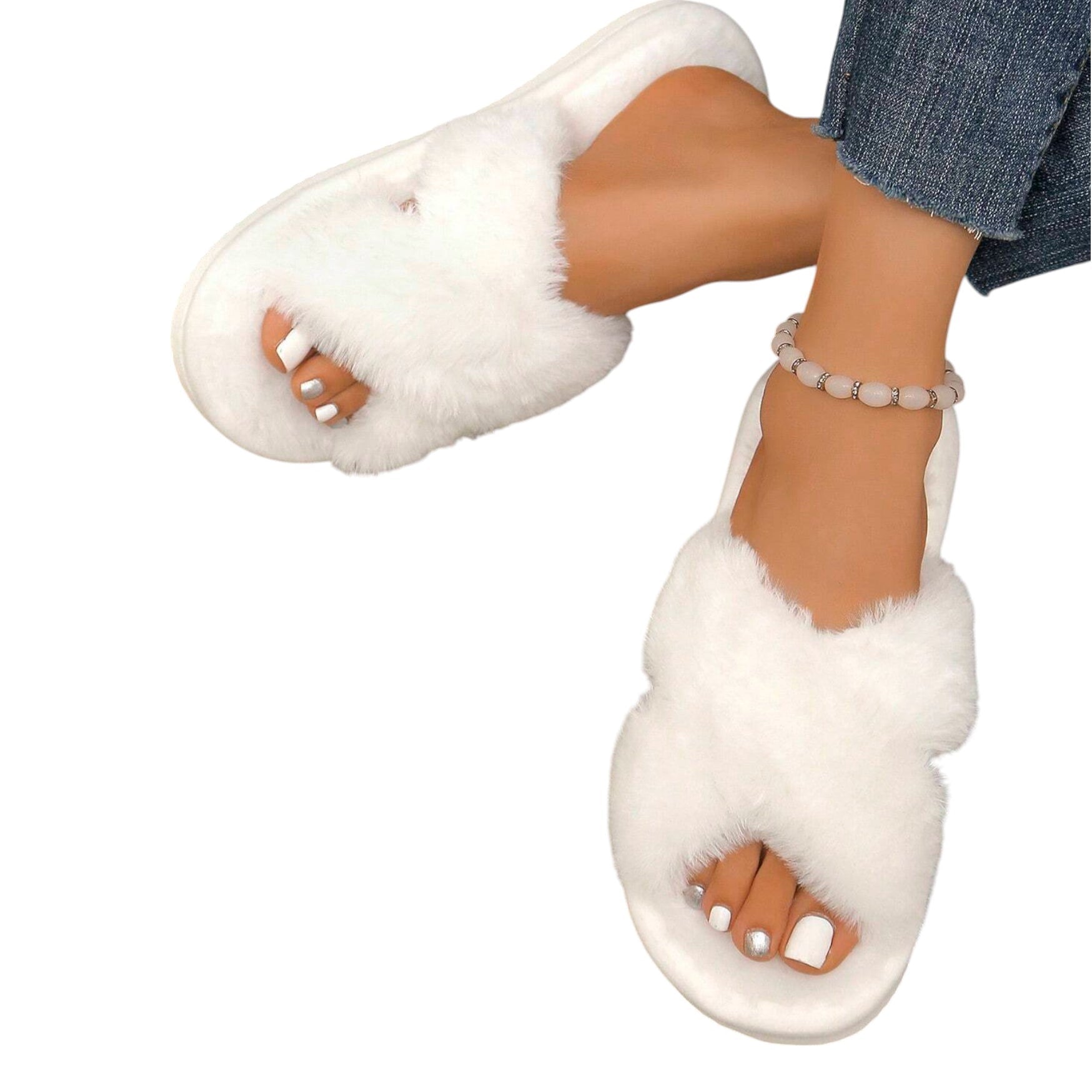 Címke nélküli, fehér, puha szőrös anyag, keresztpántos felsőrész, nyitott orr, lapos talp.