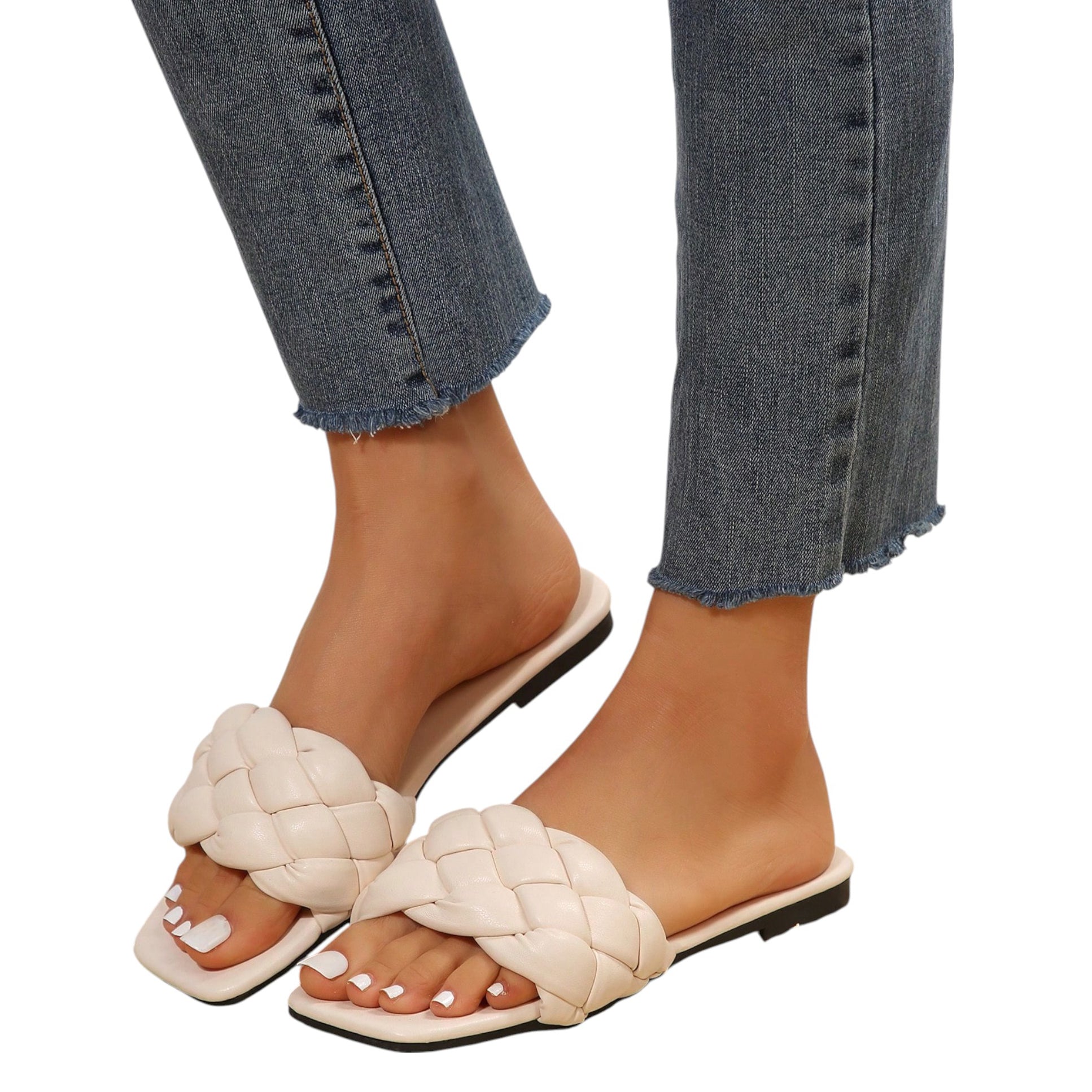 Címke nélküli, bézs, fonott pántos, nyitott orrú papucs, lapos talppal.