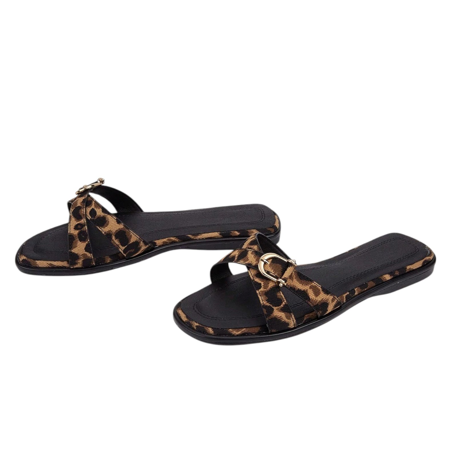 Címke nélküli, leopárdmintás, nyitott orrú, széles pánttal és arany csattal, lapos talpú.