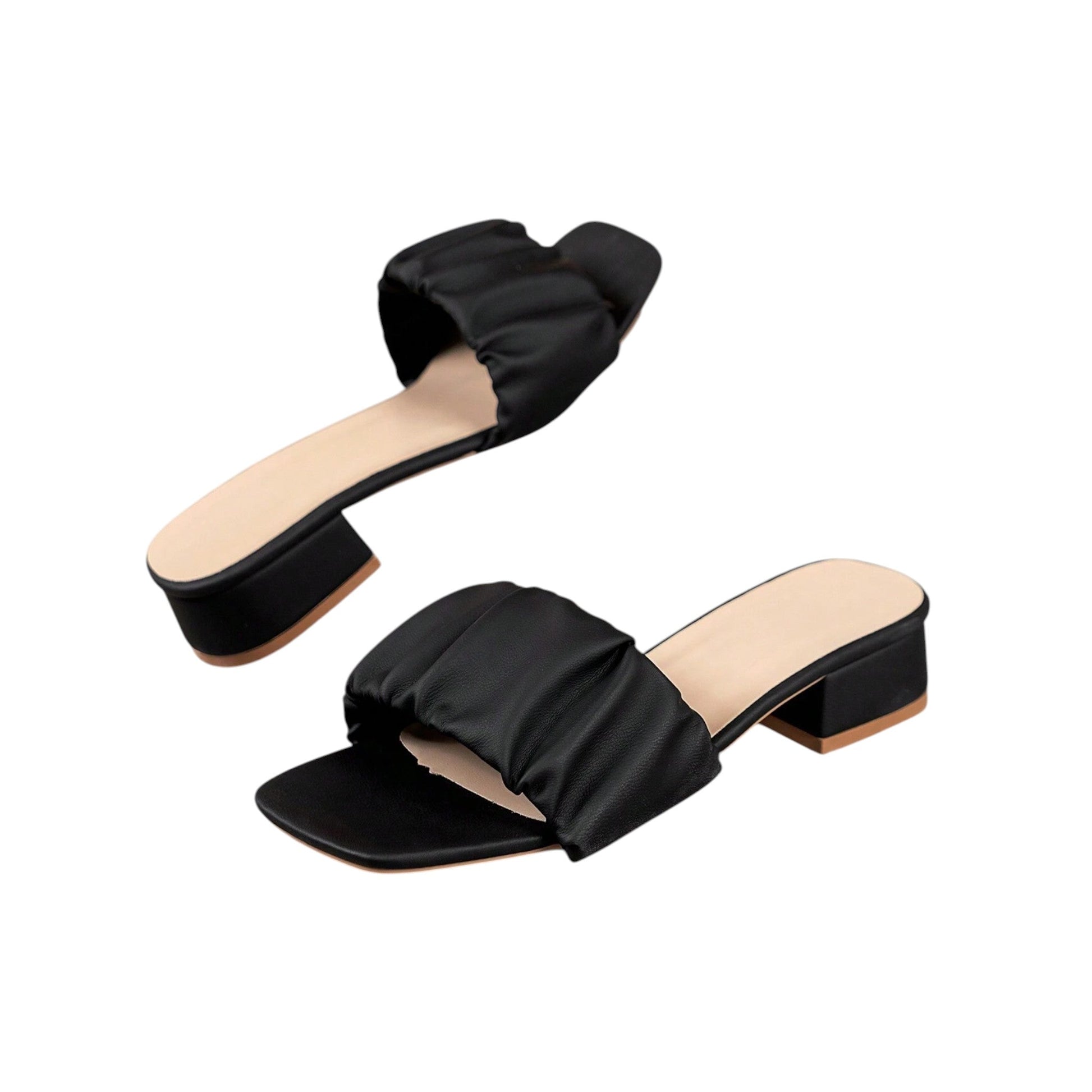Címke nélküli, fekete, ráncolt széles pántú, tömbsarkú, négyzetes orrú papucs.