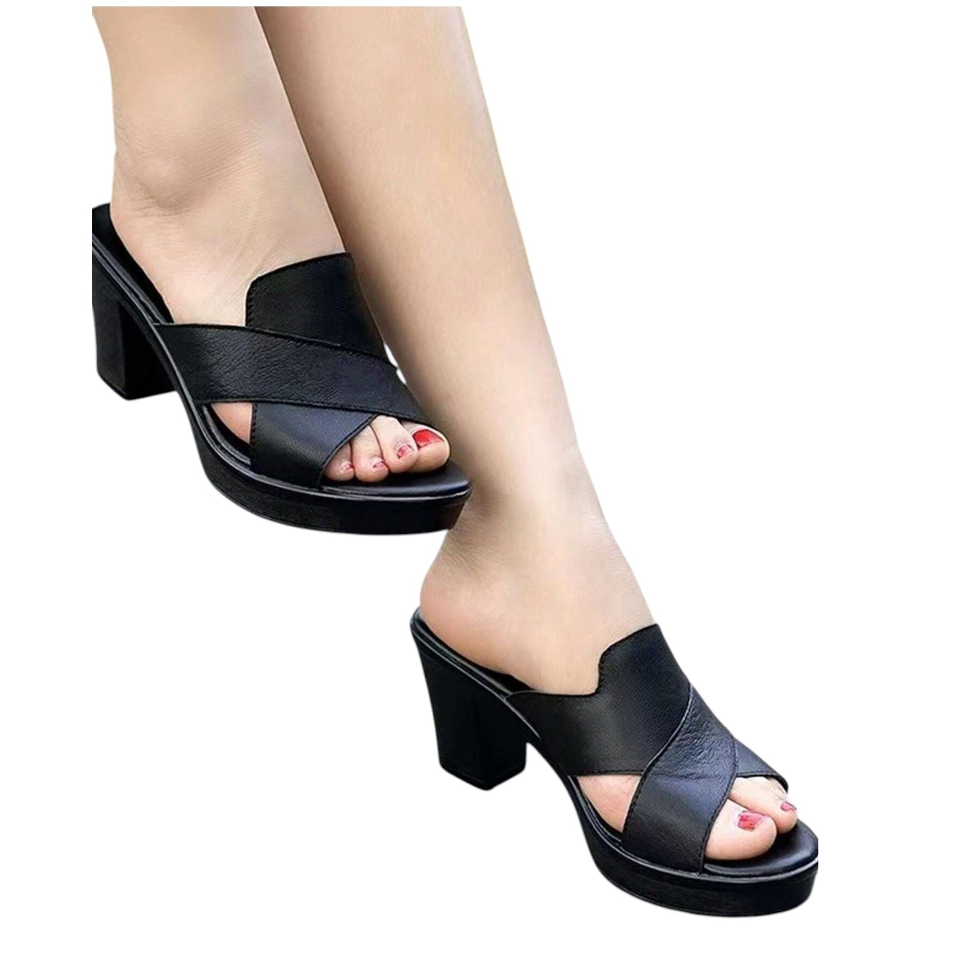 Címke nélküli, fekete, vastag tömbsarkú, platform talpú, keresztpántos papucs.
