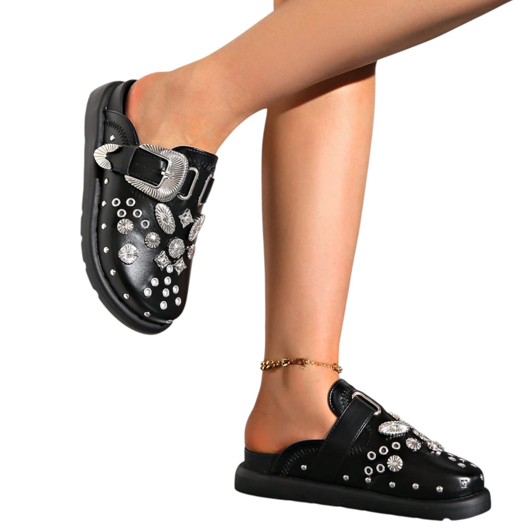Címke nélküli, fekete, szegecses díszítés, csatos pánt, zárt orrú, nyitott sarkú, vastag talpú. Belső talp hossz: 25cm