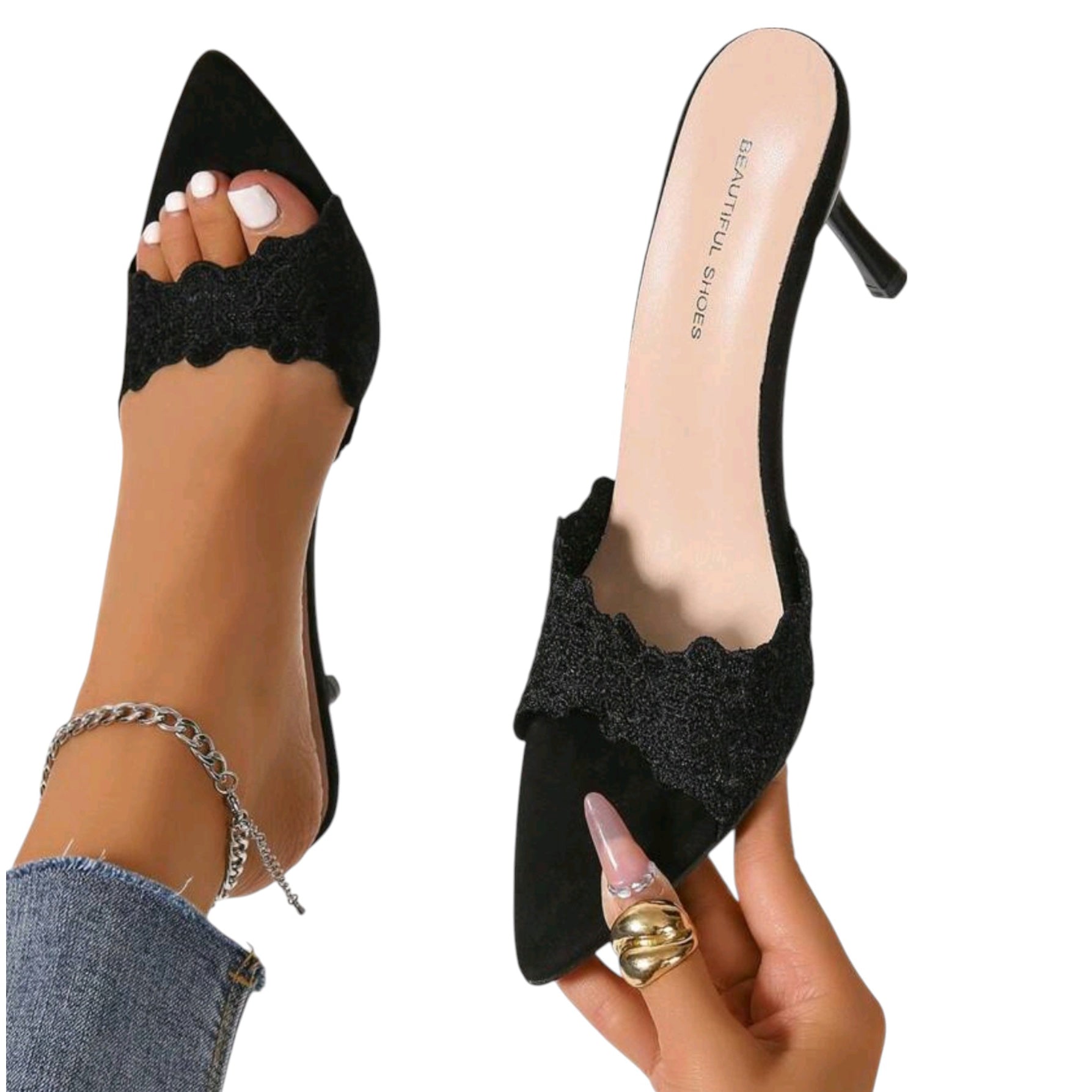 SHE fekete csipkés hegyesorrú mule