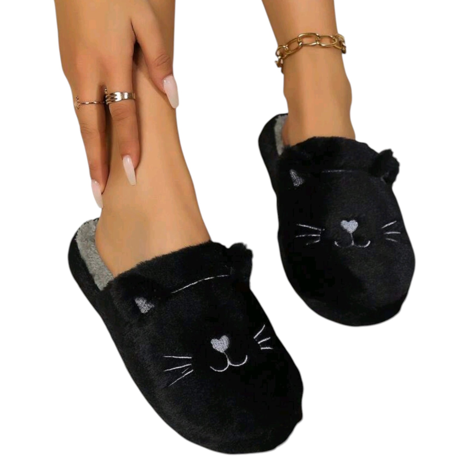 Címke nélküli, fekete, cica mintás (hímzett orr és bajusz, rátét fülek), műszőrme anyagú, zárt orrú papucs, szürke belsővel. Belső talp hossz: 23cm