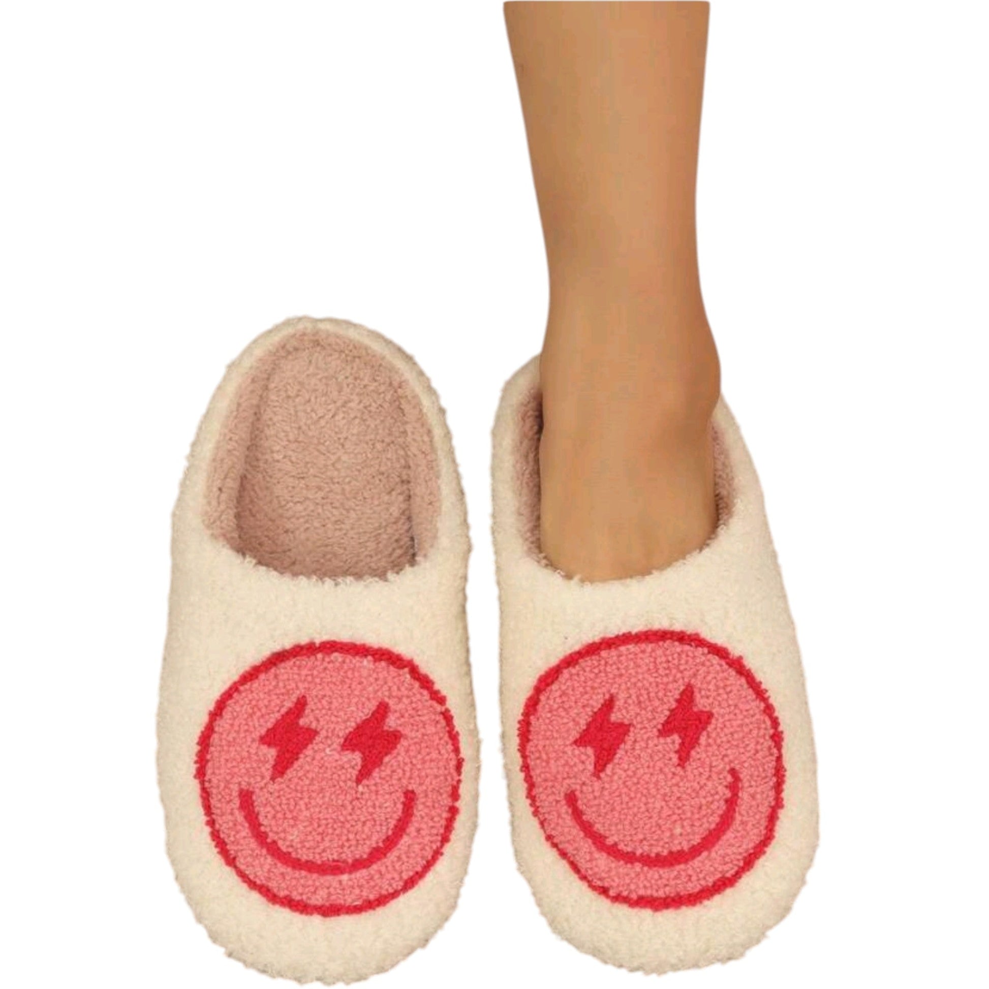 Címke nélküli, krémszínű, hímzett piros smiley mintás (villámmal a szemek helyén), műszőrme anyagú, zárt orrú, rózsaszín belsővel rendelkező papucs. Belső talp hossz: 24,5cm
